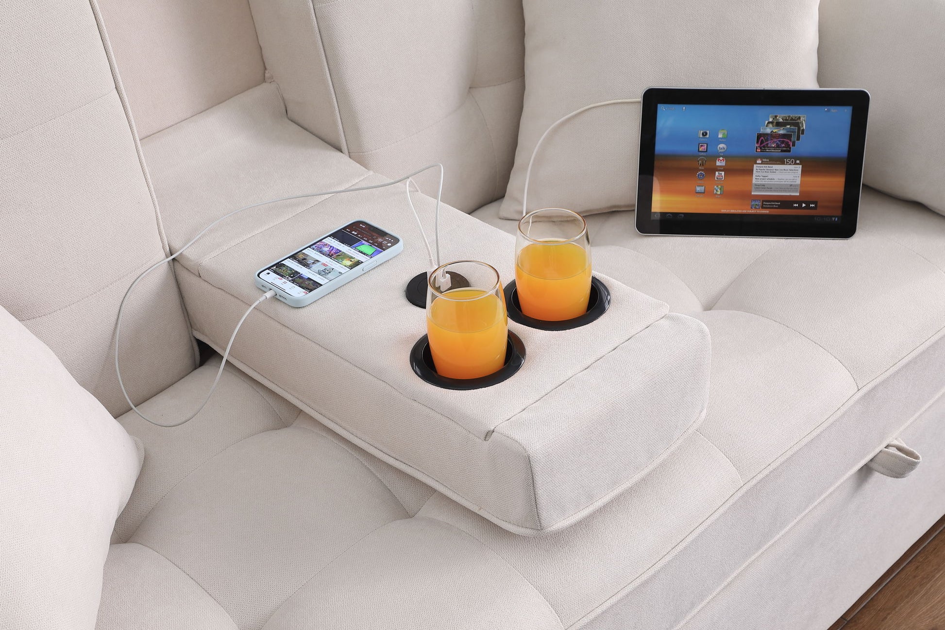 Cody II - Woven Fabric Convertible Sleeper Loveseat With Cup Holder, Charging Ports, Side Pocket, and Pocket Coil Seating - Beige