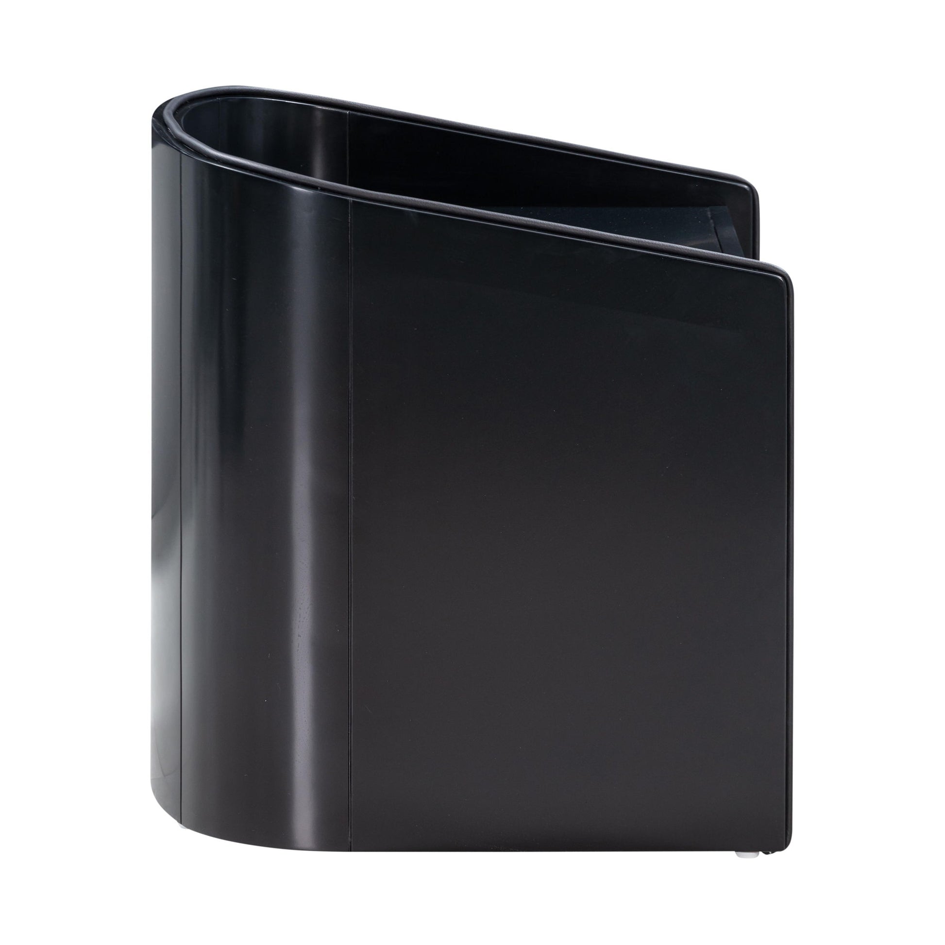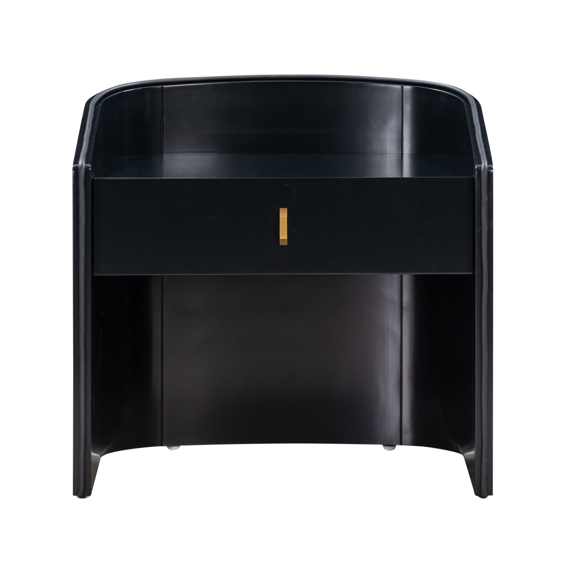Introducing the Collins Black Lacquer Nightstand: a stunning Art Deco-inspired piece with a retro pop-of-color blue drawer. Its sexy sloped silhouette exudes high-style, while the vibrant drawer adds a punchy touch. Elevate your bedroom with this unique and stylish nightstand that combines timeless design with a playful twist.