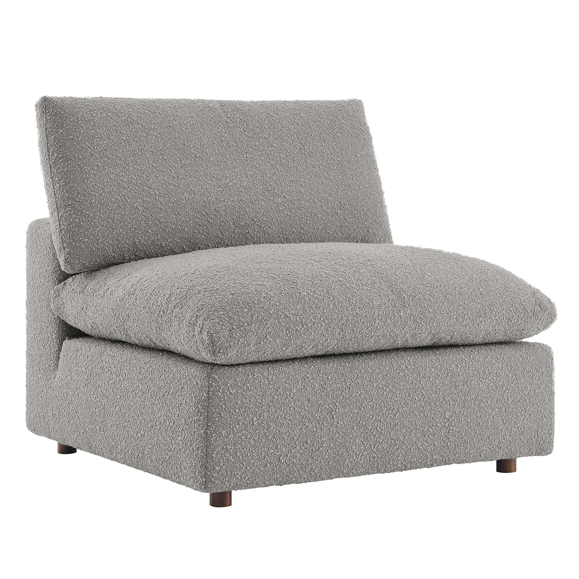A haven for cozy relaxation, Commix features plush comfort and a clean-lined design. The spacious profile makes an attractive statement in the modern home. Covered in a boucle fabric with a charming nubby texture, this upholstered armless chair comes with a solid wood construction and foam padded and duck down cushions for a luxurious sink-in feel. Commix features overstuffed down feather cushions that offer a feeling of relaxation and calming comfort while lounging, making it the perfect addition to the living room, family room, or game room. Made for sprawling out or curling up, Commix beckons you and guests to sit and stay a while. Includes plastic foot glides. Armless Chair Weight Capacity: 331 lbs.