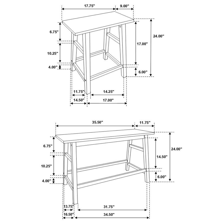 A charming addition to a kitchen breakfast nook or compact dining area, this country four-piece counter height table set gives off modern farmhouse vibes. A two-tone finish offers a subtle contrast and rustic-inspired design. A chestnut finish covers the tops of the table, stools and bench, as the rest on a bold, dark brown finish frame. The narrow rectangular counter height table features a trestle base and straight square legs for a clean lined effect. In addition, the two stools and bench also offer a similar style with square legs that flare out toward the feet and offer a footrest for extra support.