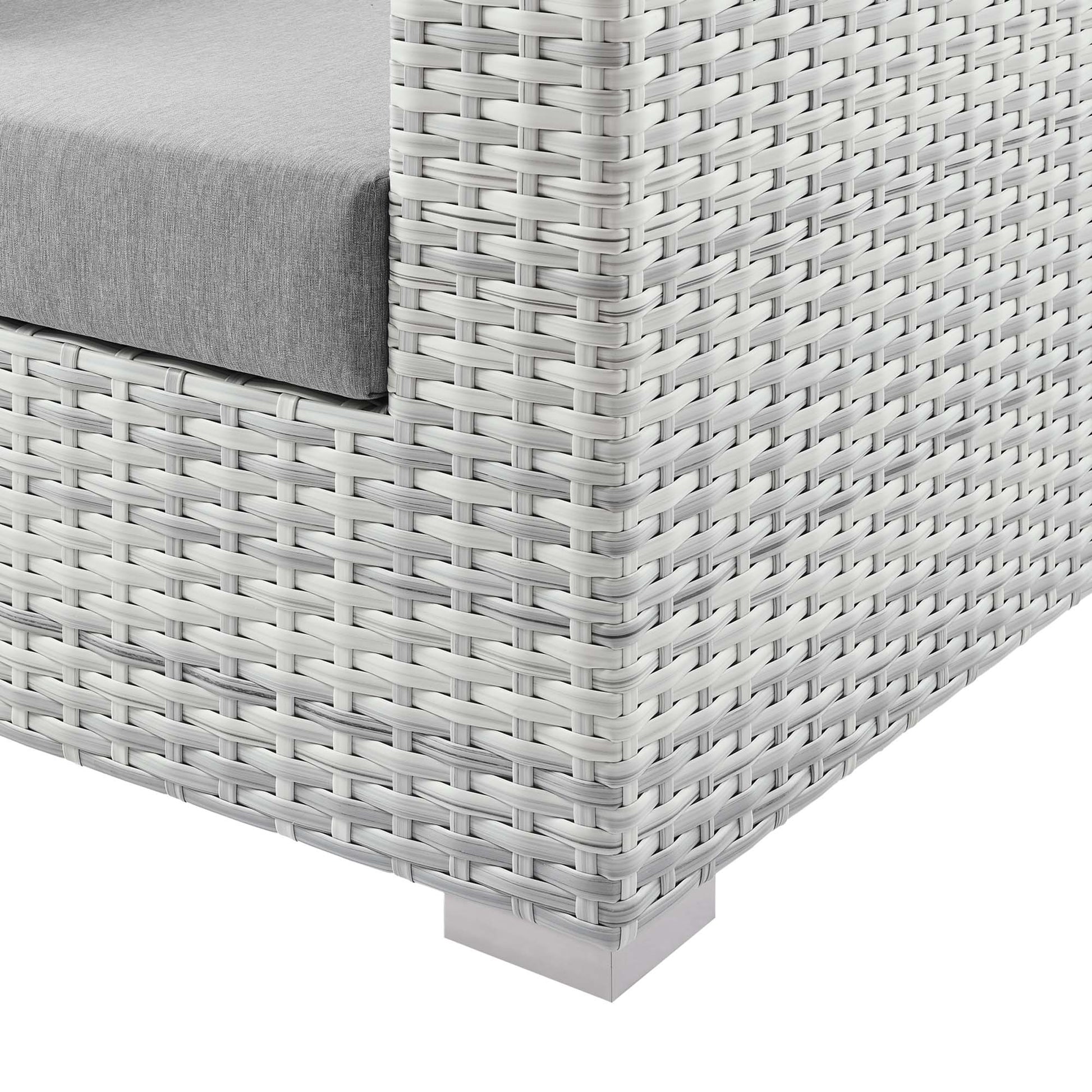 Gather stages of sensitivity with the Convene Outdoor Sectional series. Made with a synthetic rattan weave and a powder-coated aluminum frame, Convene is a versatile patio armchair from an outdoor collection that shifts and combines according to the spontaneous needs of the moment. Outfitted with all-weather fabric cushions, the Convene Armchair leaves a positive impression on friends and family while enhancing your patio, backyard, or poolside retreat with palpable distinction.