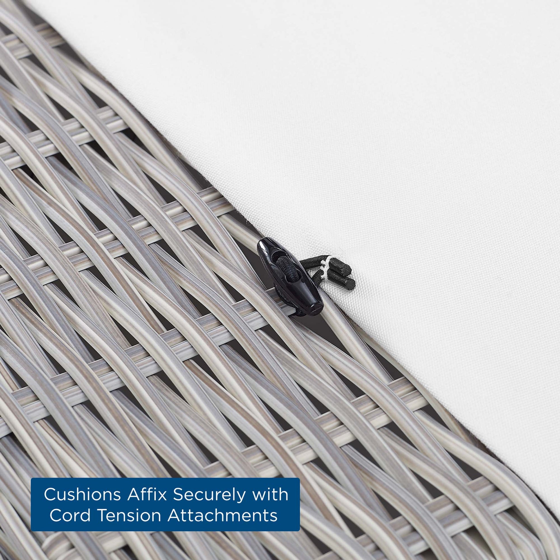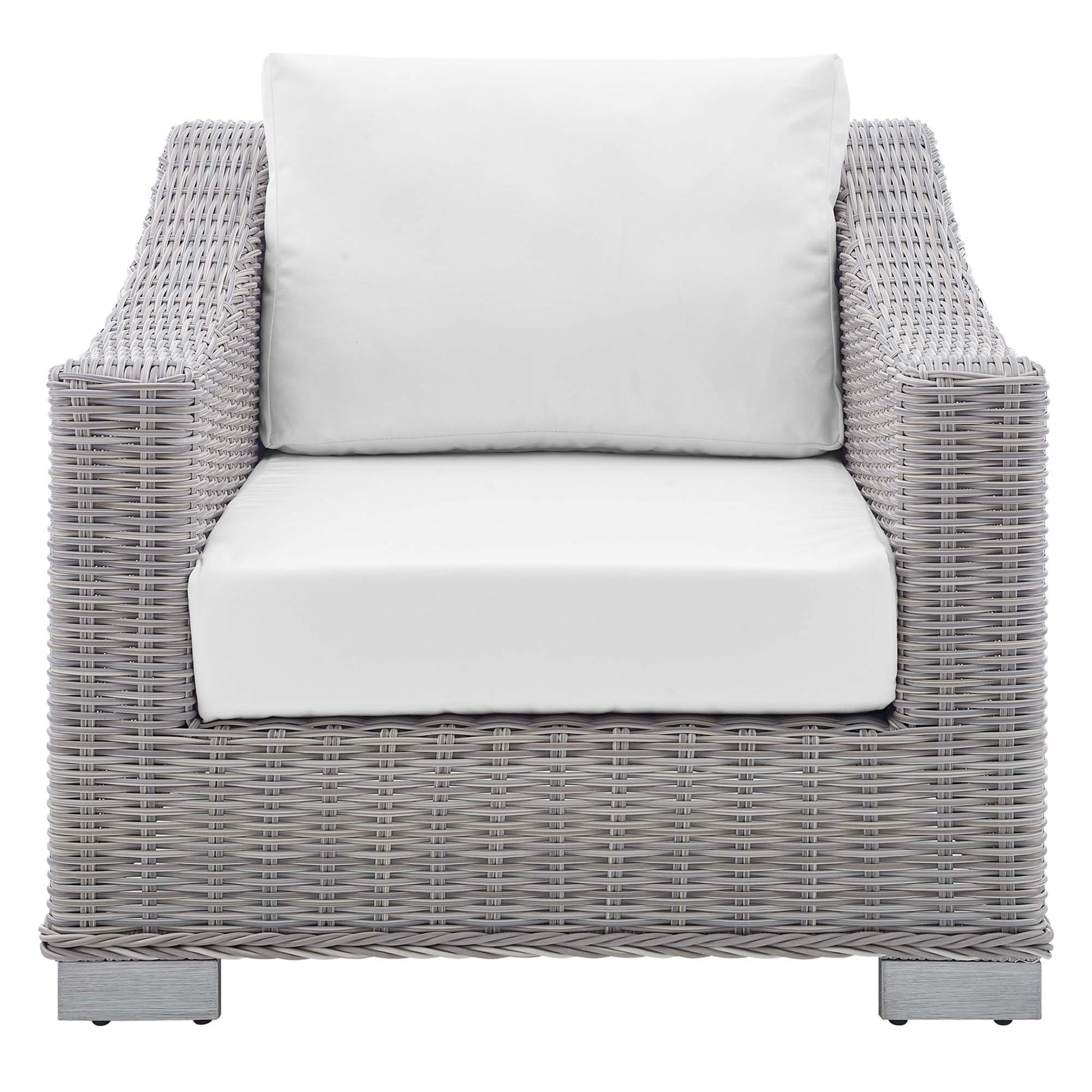 Enjoy fresh air and alfresco relaxation with the Conway Outdoor Patio Wicker Rattan Armchair. Wrapped in UV-resistant light gray synthetic wicker rattan, this patio chair boasts organic texture and a neutral hue that brings a calming presence to your outdoor space. The frame of this outdoor chair is crafted with durable powder-coated aluminum and rests on L-shaped legs with plastic foot glides. Thick foam padded cushions covered with washable water-resistant Sunbrella� fabric covers offer a comfortable seat and affix securely to the lounge chair with cord tension attachments. Trending aesthetics and a classic design define this outdoor patio furniture collection making it a beautiful addition to any outdoor space including the backyard, patio, porch, balcony, or poolside. Assembly required. Patio Chair Weight Capacity: 300 lbs.
