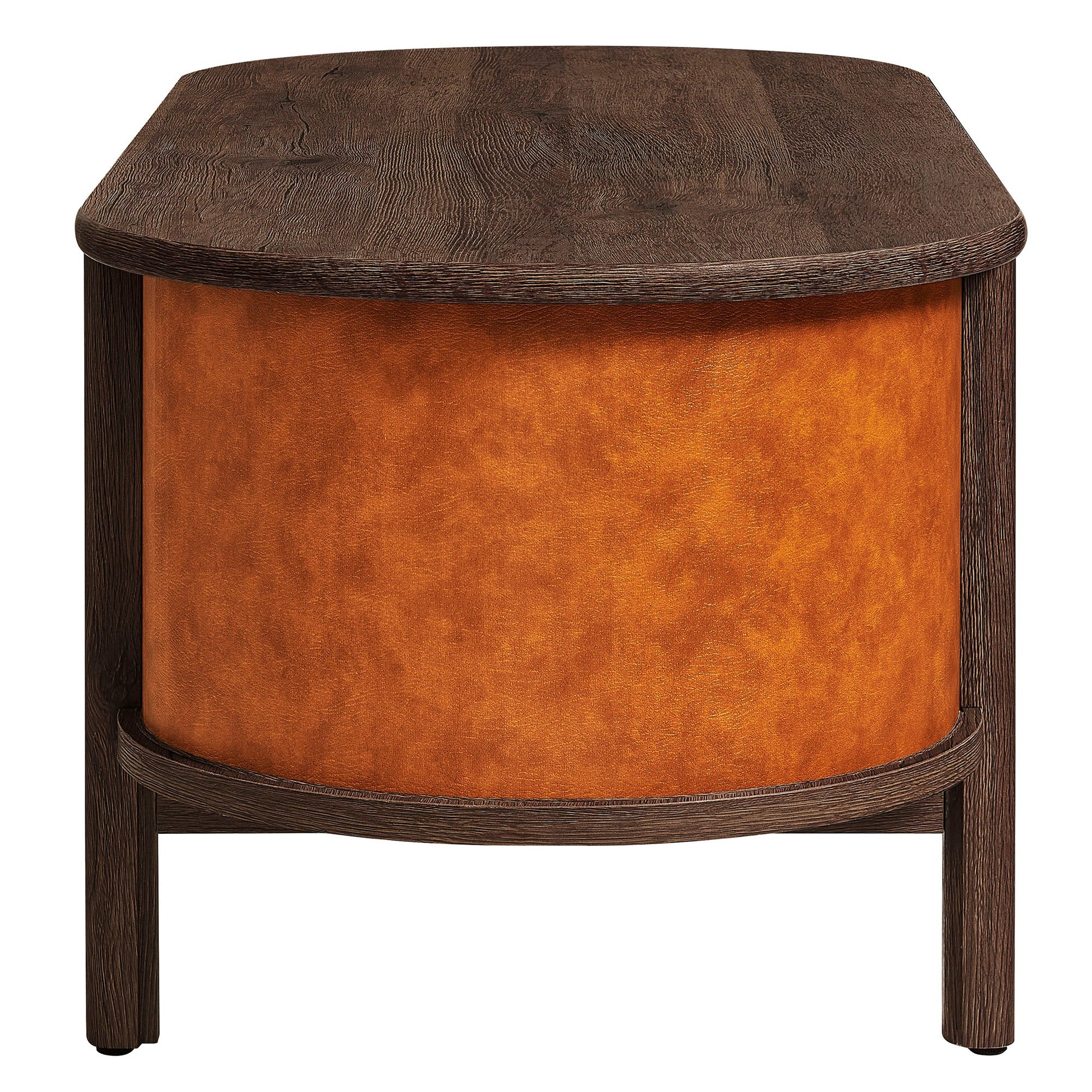 Add vintage character and practical storage to your living room with the Coralie Curved Coffee Table. Wrapped in vegan leather with wood grain laminate, this 45" oval coffee table combines modern craftsmanship with a warm, lived-in aesthetic.