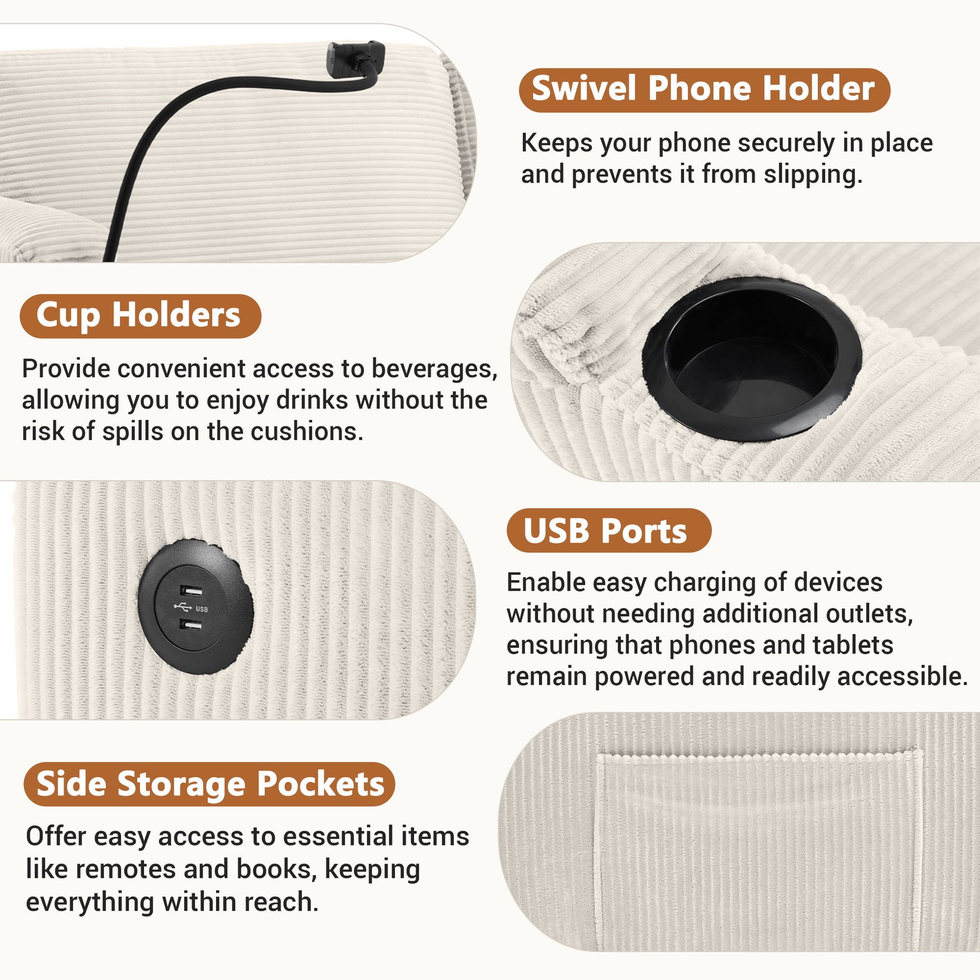 - Designed for Convenience - Equipped with two USB ports and a phone holder, the sofa allows easy charging of devices and secure phone placement. This ensures that phones and tablets remain powered and accessible without additional outlets.