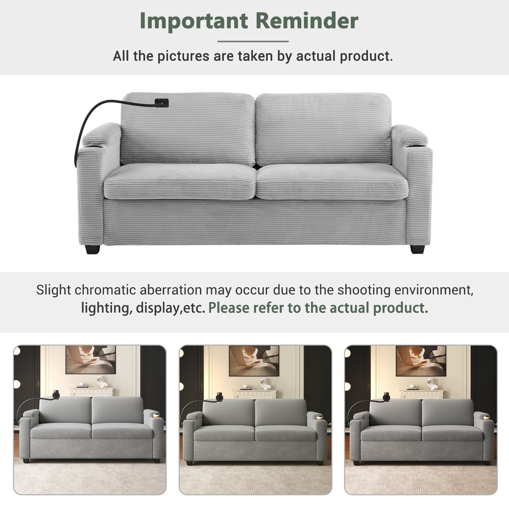 Corduroy Sleeper Sofa Loveseat Sofa With Full Size Mattress, 2 USB Ports, 2 Cup Holders, 2 Side Pockets And A Phone Holder For Living Room - Gray