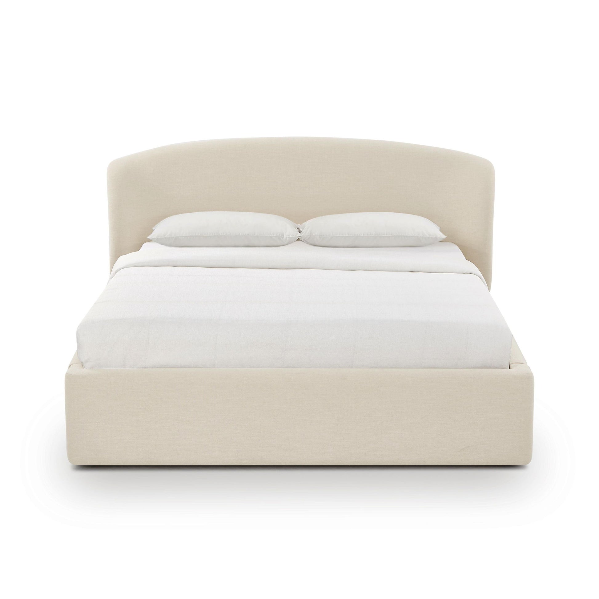 Sustainability gets cozy in the Corey Taupe Storage Bed, crafted from soft, upcycled linen made of reclaimed plastic bottles. With padded sheltering wings and hidden drawers on smooth-glide casters, it's the definition of chic storage and dreamy comfort.