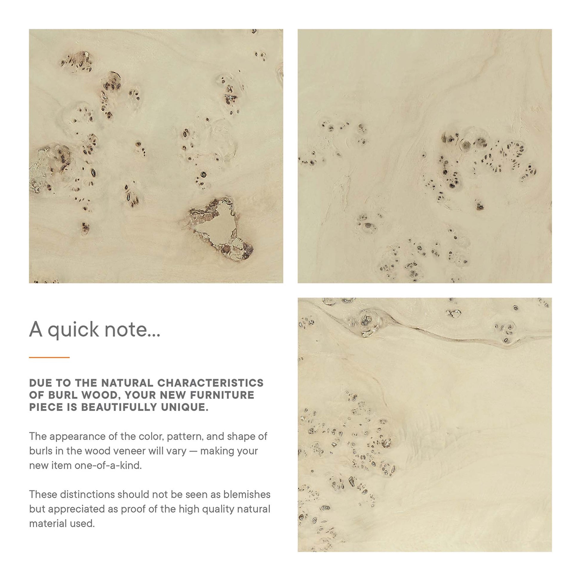 Update your decor with this round burl wood coffee table, a sophisticated blend of modern elegance and nature's charm. Constructed from MDF and mappa burl veneer, the Cosmos coffee table is a solid piece of furniture that captures the intricate beauty of real wood. The rich burl wood veneer, radiating a distinctive charm and character, makes every table unique. The clean lines and refined design bring a touch of sophistication to any space. With leveling, non-marking adjustable feet, your flooring will remain protected. It has a total weight capacity of 441 lbs.