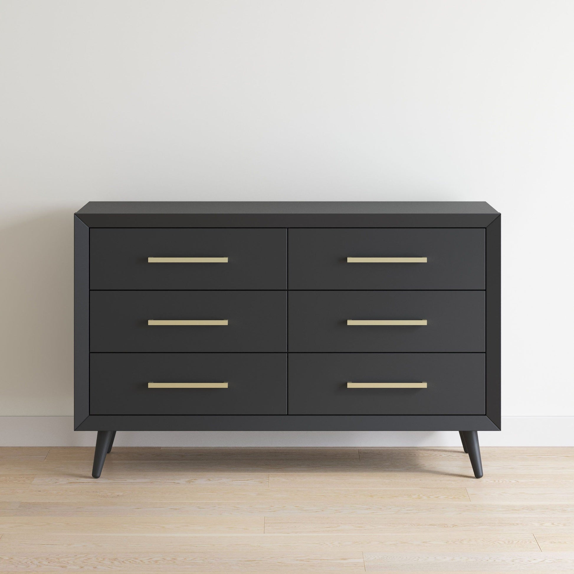 The coordinating 6-drawer dresser mirrors the aesthetic appeal of the crib, featuring canted legs and smooth ball-bearing drawer glides for effortless usability. With a non-toxic, baby-safe finish and the option to pair with a changing table topper, this nursery set is not only visually striking but also supremely functional, making it the perfect centerpiece for your child's room.