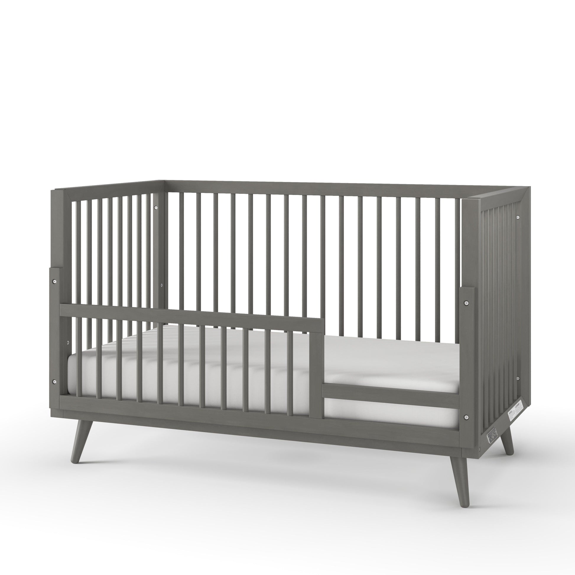 The versatile 4-in-1 design of the crib allows it to evolve as your child grows, easily transforming into a toddler bed, day bed, and eventually a full-sized bed with the addition of a toddler guard rail and bed rails, which are sold separately. Crafted from robust pine wood and veneers, the crib boasts a strong metal mattress support that adjusts to three different heights, ensuring both safety and convenience for your growing infant. Each feature of this crib has been carefully designed to highlight its modern simplicity while ensuring it meets ASTM and CPSC standards for safety.
