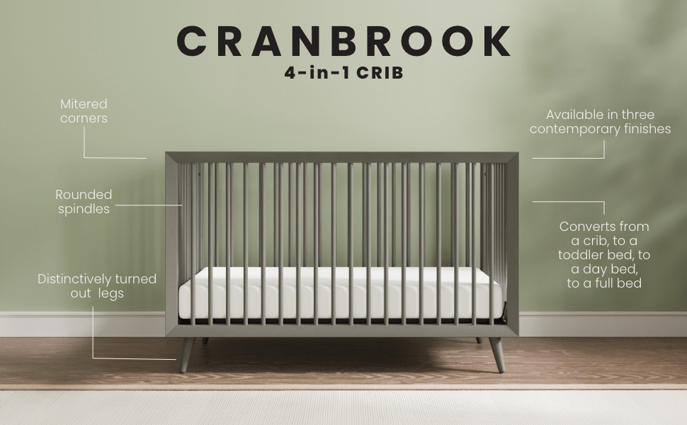 Infuse your baby's nursery with a sophisticated Mid Century Modern aesthetic through the Halo Sleep Cranbrook 4-in-1 Convertible Crib. This striking crib is characterized by its sleek mitered corners, elegantly turned legs, and rounded spindles, all of which contribute to its understated elegance. Available in three refined finishes, this crib not only enhances the beauty of the space but also exemplifies a commitment to quality craftsmanship and enduring design. Complement your nursery by pairing this piece with other items from the Child Craft Cranbrook collection for a cohesive look.