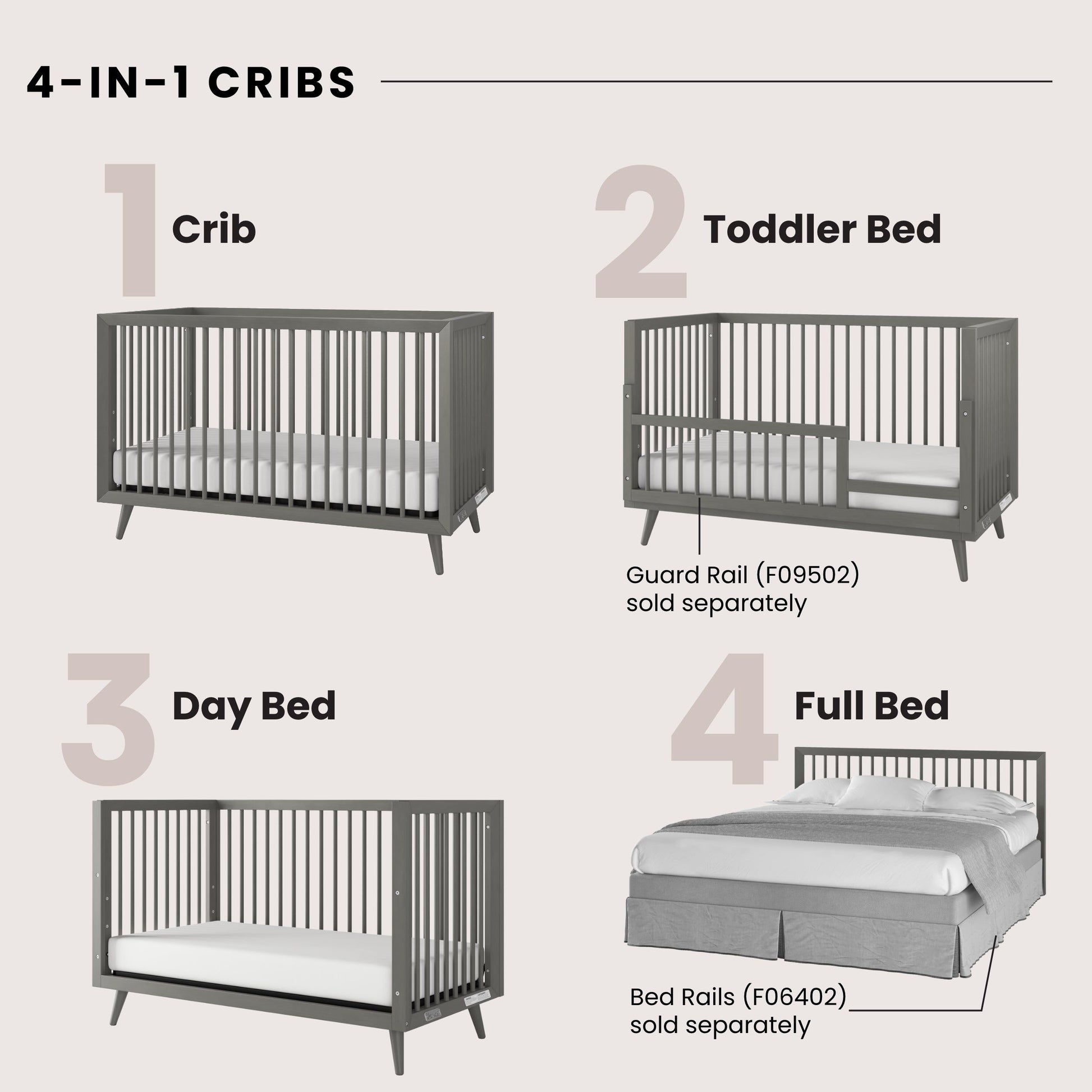 - 4-in-1 design adapts with your child, converting from crib to toddler bed, day bed, and full bed.