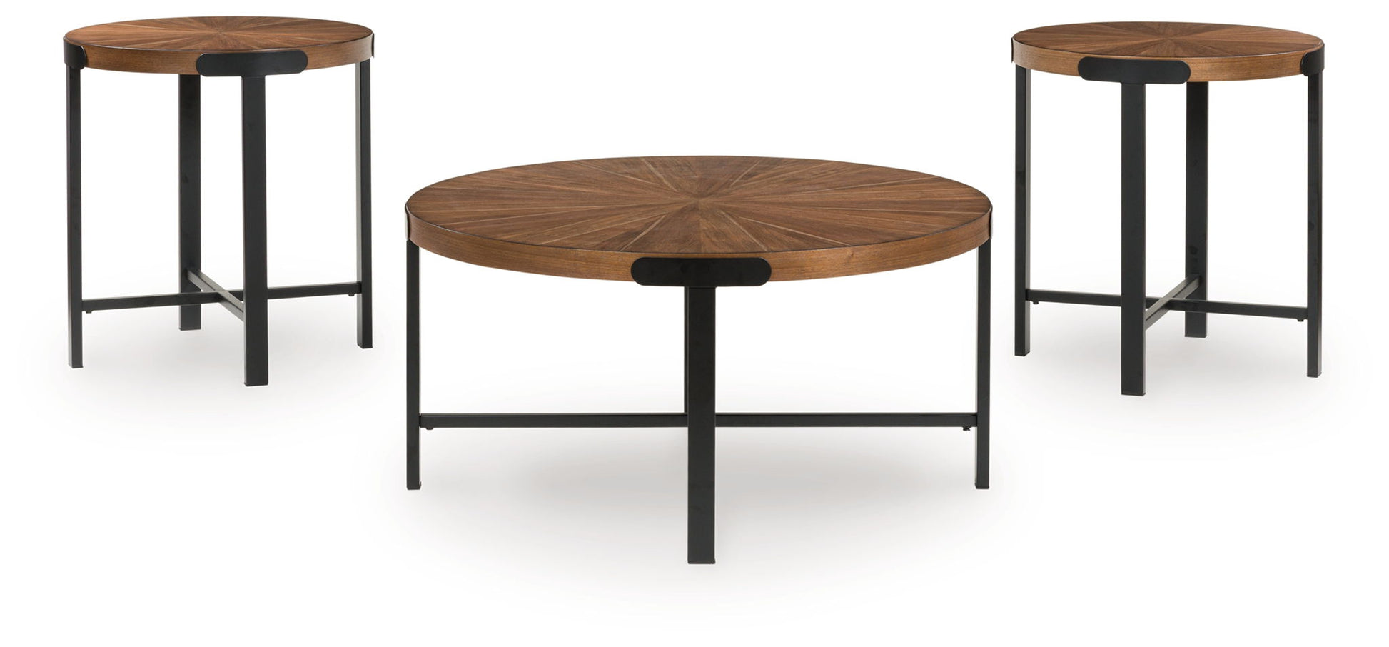 This occasional table set contrasts a rich brown wood tone with dark bronze-tone metal legs for a casual contemporary feel. An inlay sunburst pattern on the tabletops channels both modern aesthetics and the comforting vibe of natural materials. Complete with a coffee table and matching end tables, this set is sure to add chic character to your living space.