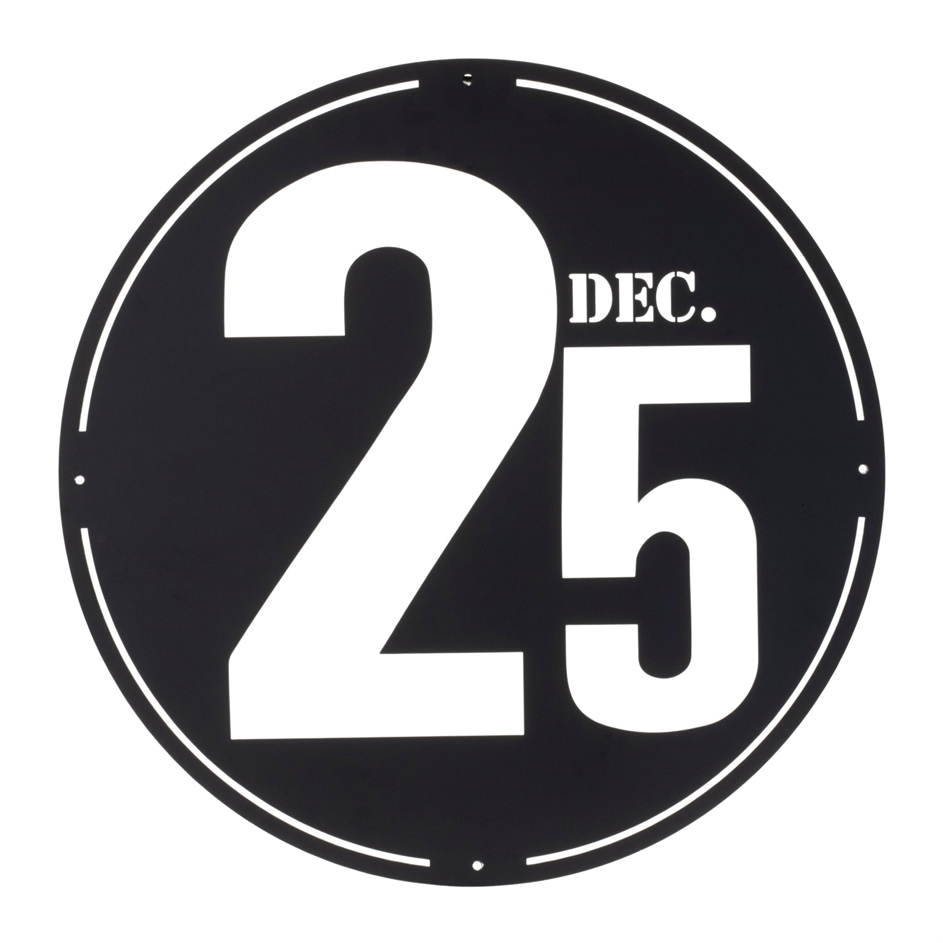 Celebrate the most wonderful time of the year with this Cut Metal December 25th Plaque, featuring a sleek and modern design that highlights the iconic "Dec 25" sentiment. Crafted from high-quality black iron, this stylish wall accent adds a bold statement to any space, whether it’s your living room, entryway, or as a special gift to someone you cherish. The piece contains four metal nail holes for screwing it securely to the wall of your home.