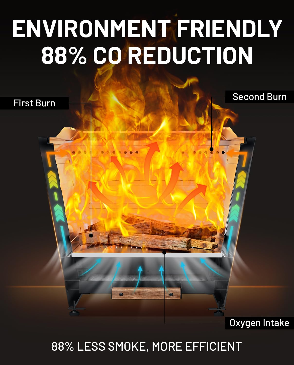 - Scientific internal airflow system promotes secondary combustion for cleaner fires