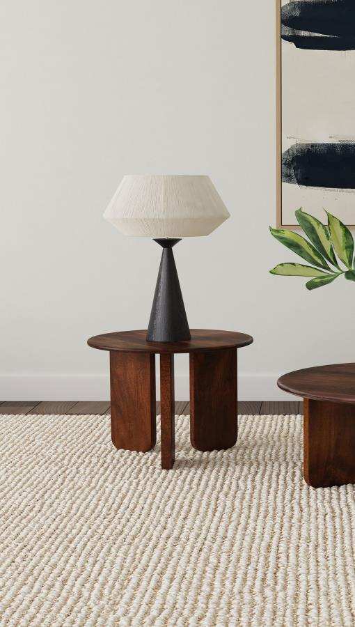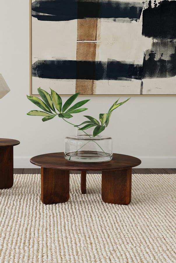 Embrace artistry with the interesting silhouette of a modern wooden table. It's designed to create an inviting presence at the center of your living room seating ensemble. The table features solid mango wood construction in a rich finish that allows wood grain details to show through. A round tabletop with a rounded edge creates an inviting centerpiece, while an interesting base adds visual dimensionality. Three slab legs are angled inward, creating depth and character that's sure to stand out.