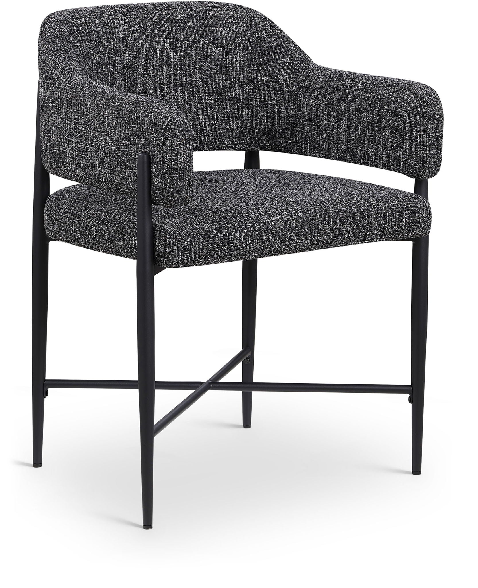 Blending effortless comfort with modern design, the Dame polyester fabric upholstered dining chair offers a relaxed, trendy look. A matte black iron frame provides contrast against the polyester textured weave of light brown, cream, and beige hues. Place it in dining spaces or casual corners for seating that feels as good as it looks.