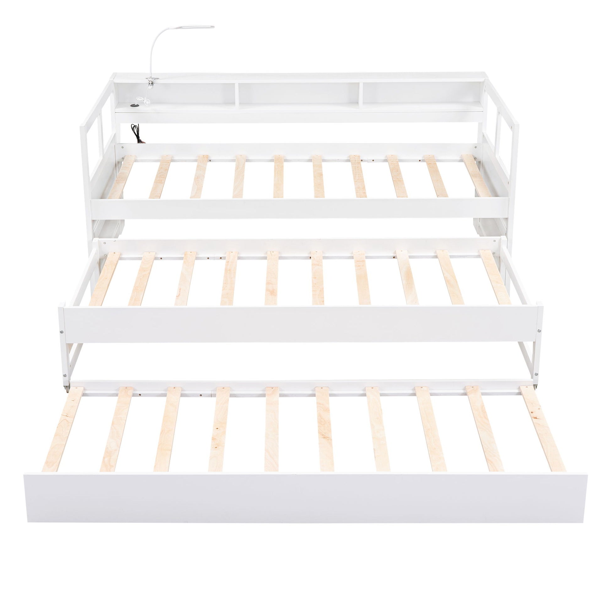Twin Long Daybed With 2 Trundles, 3 Storage Cubbies, Built In USB Charging Light - White