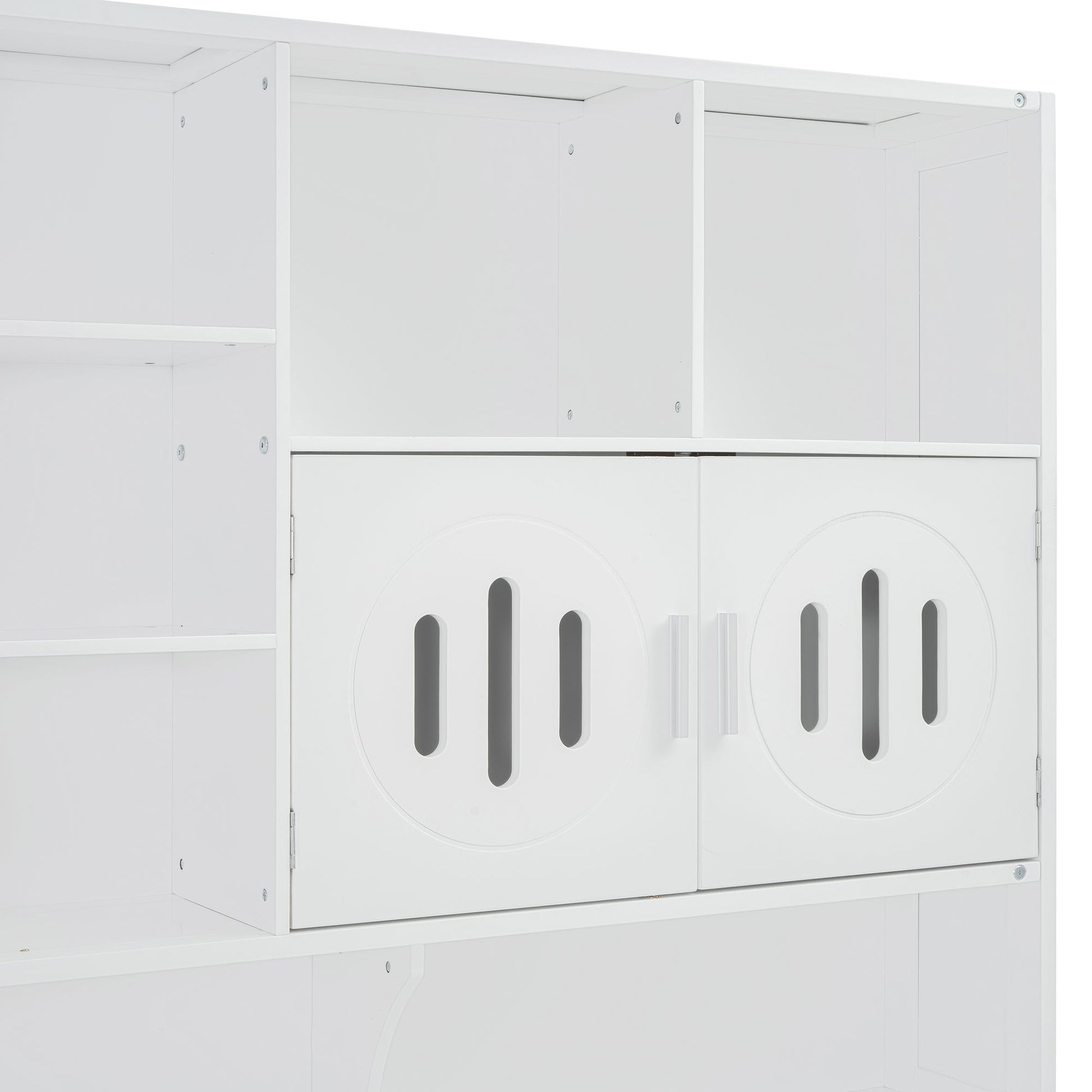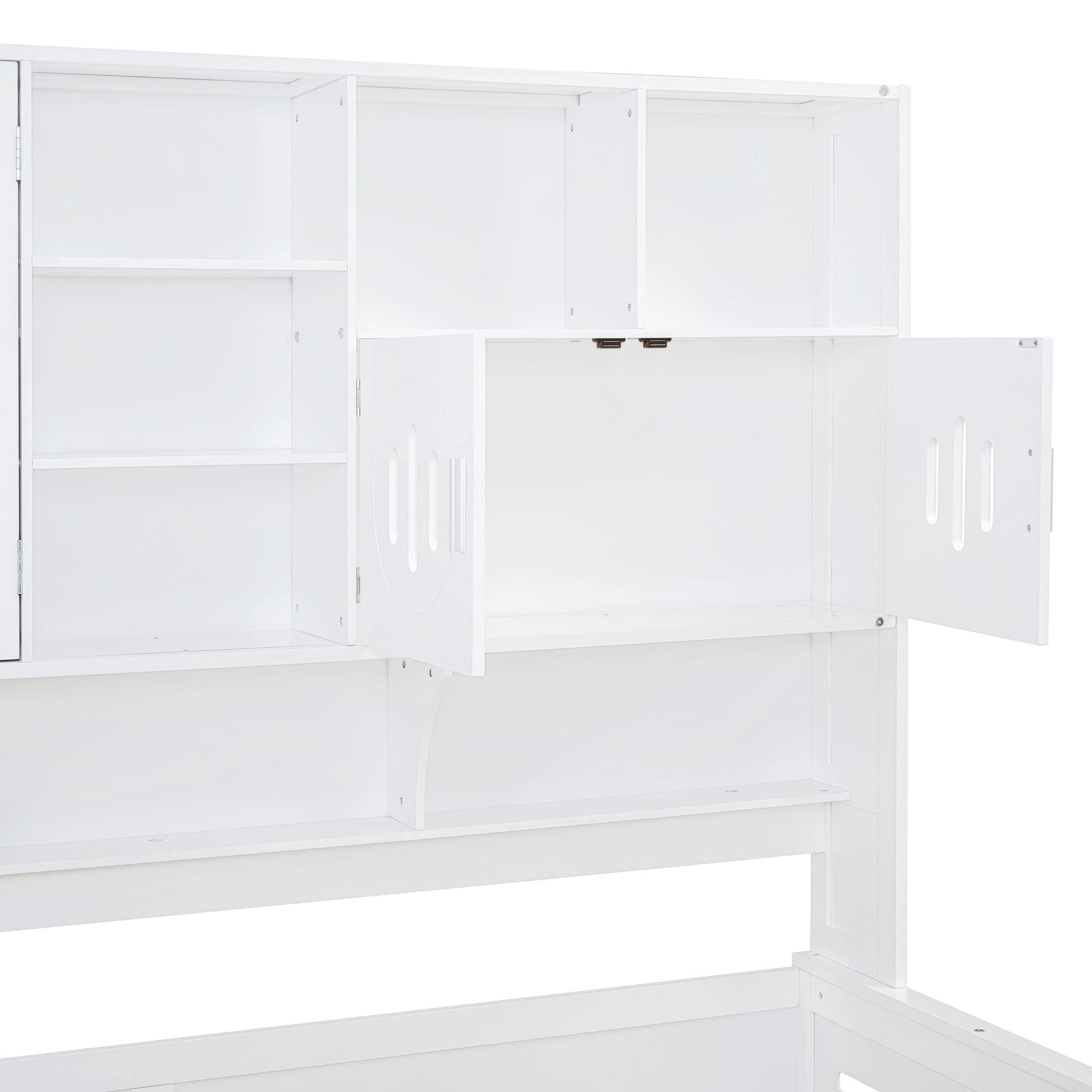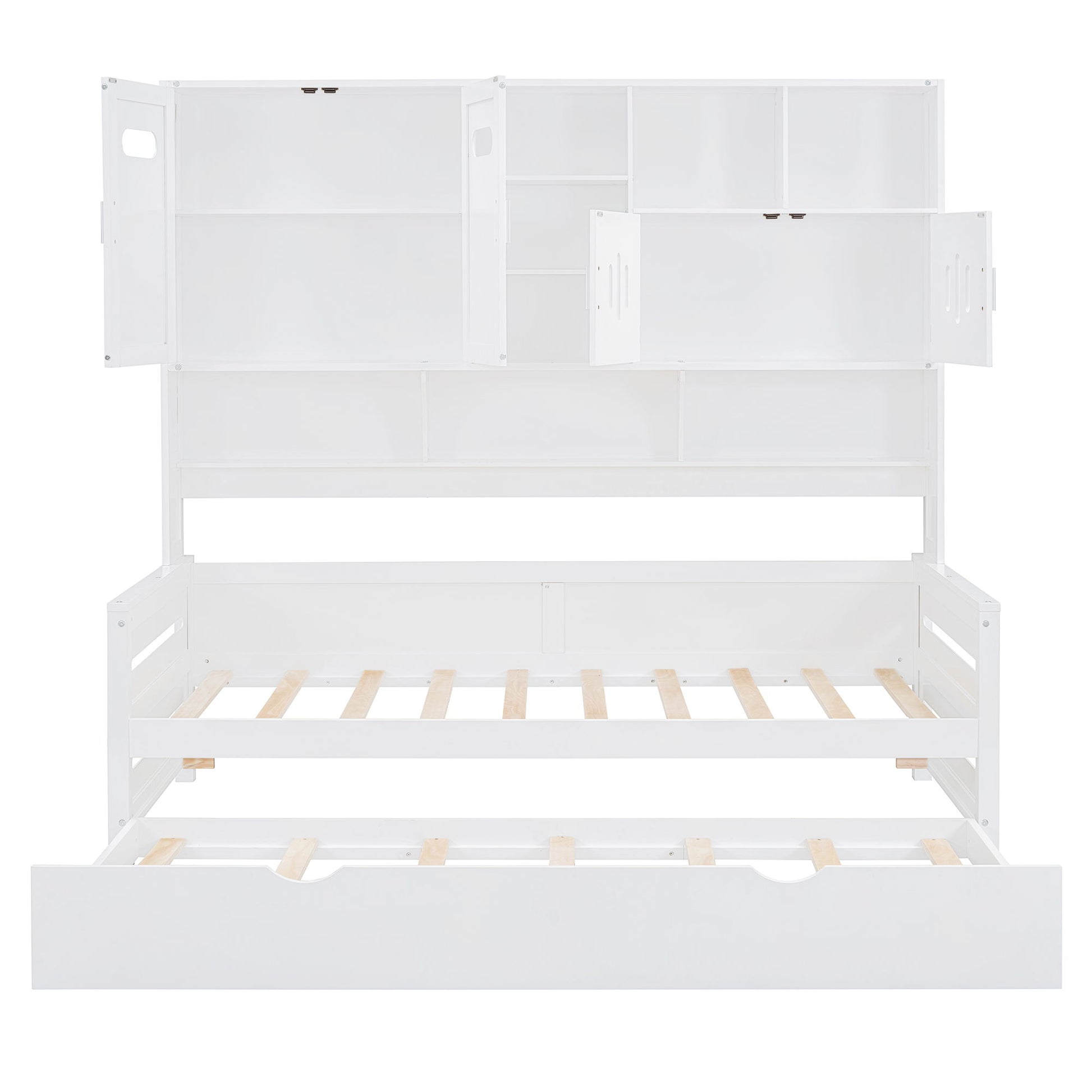Full Size Wooden Daybed With Twin Size Trundle, And All In One Cabinet And Shelf - White