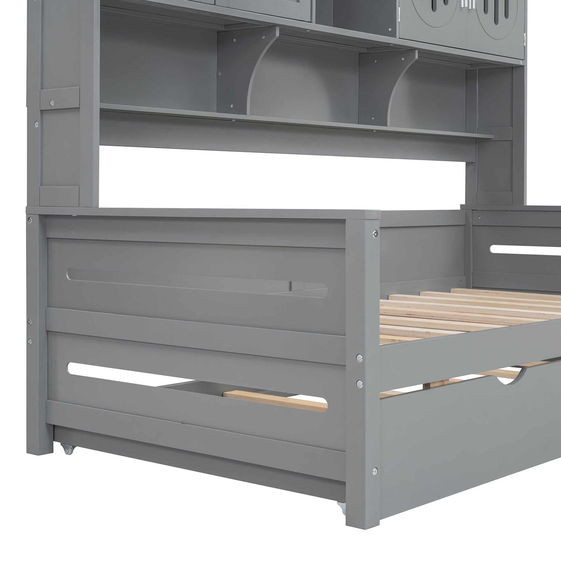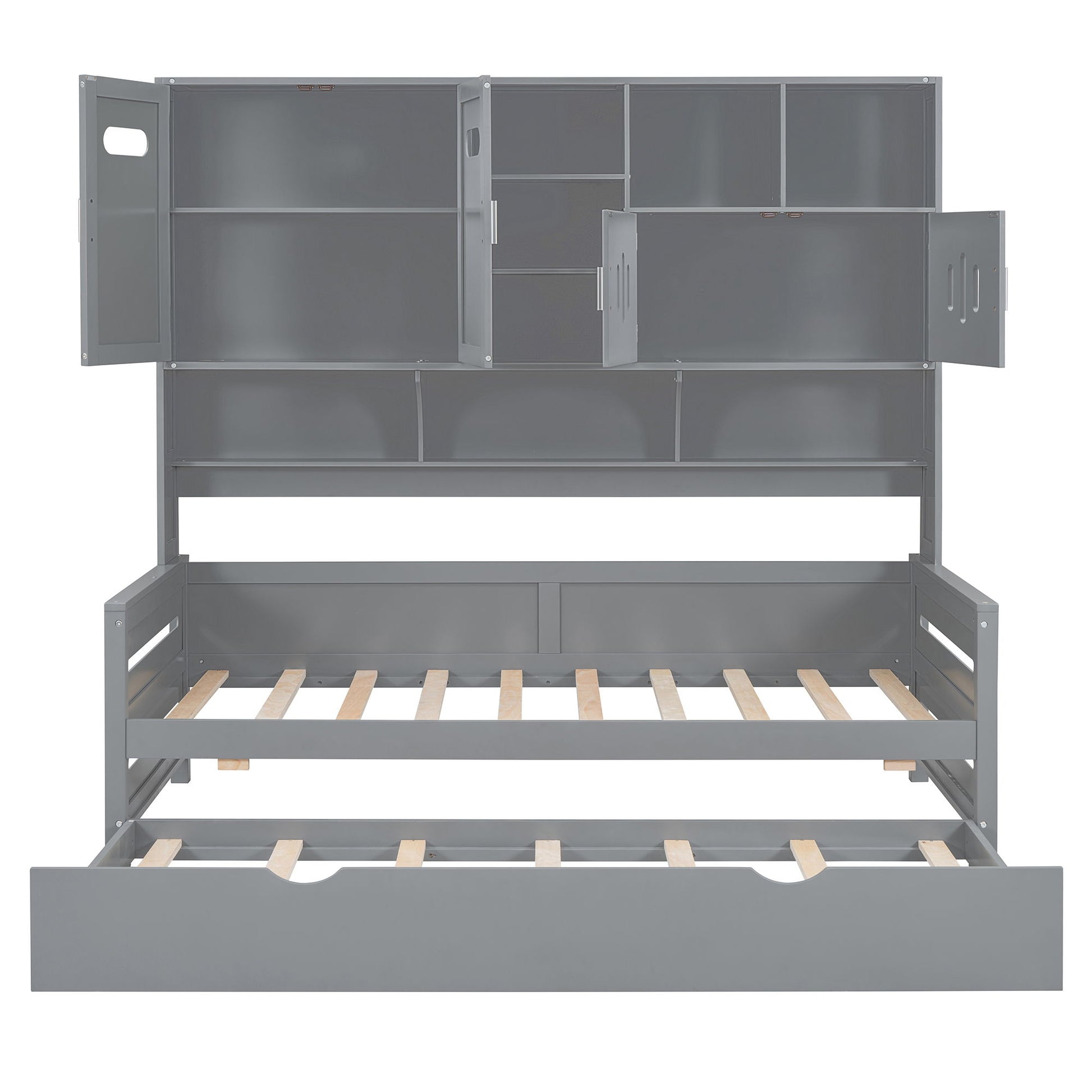 Full Size Wooden Daybed With Twin Size Trundle, And All In One Cabinet And Shelf - Gray