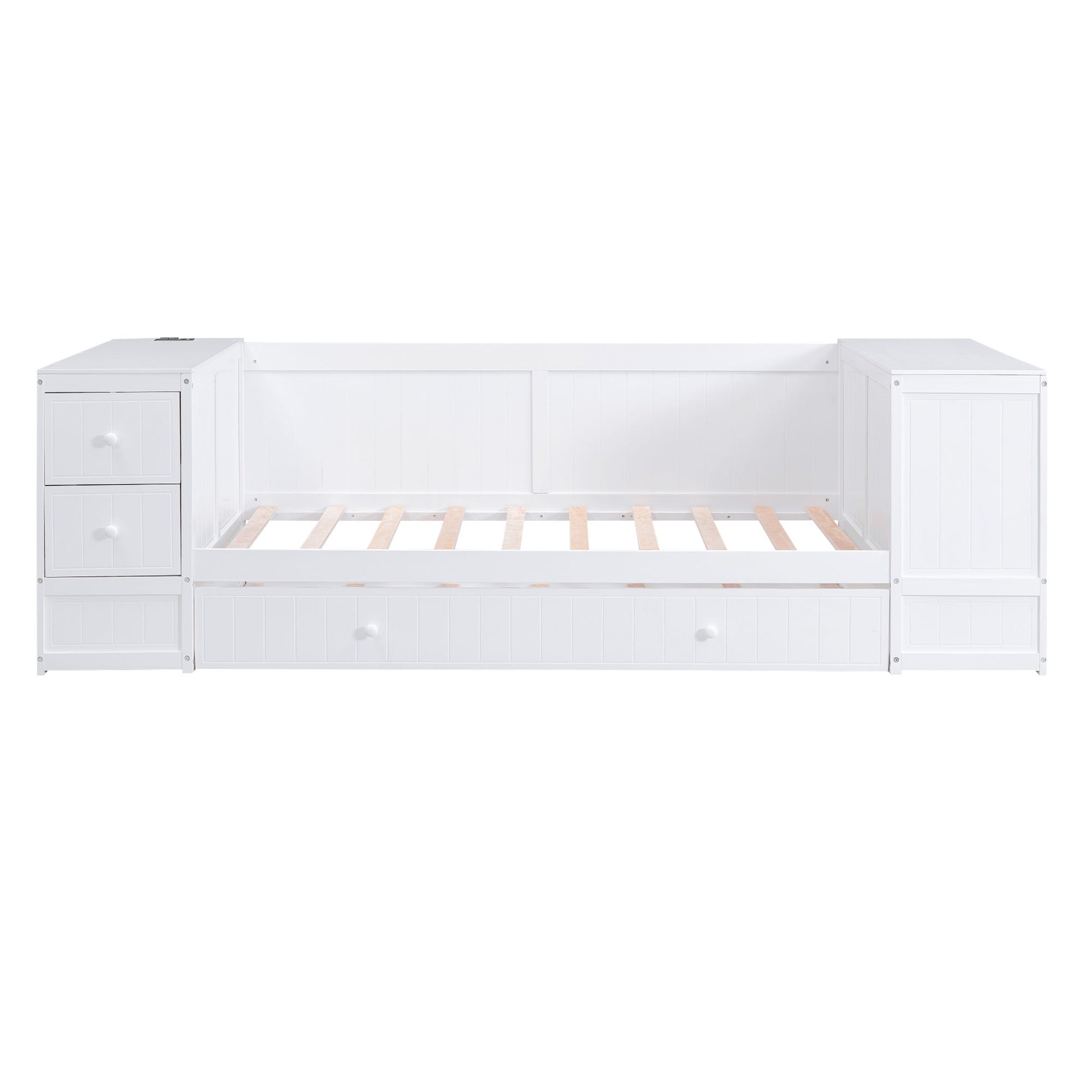 Twin Size Daybed With Storage Arms, Trundle And Charging Station - White
