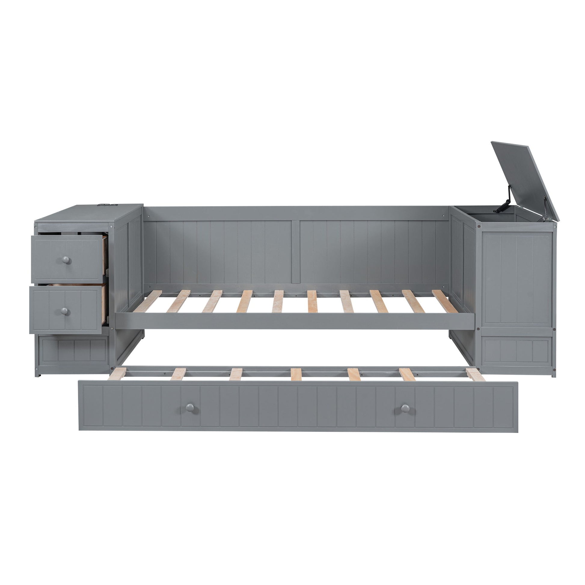 Twin Size Daybed With Storage Arms, Trundle, Charging Station - Gray