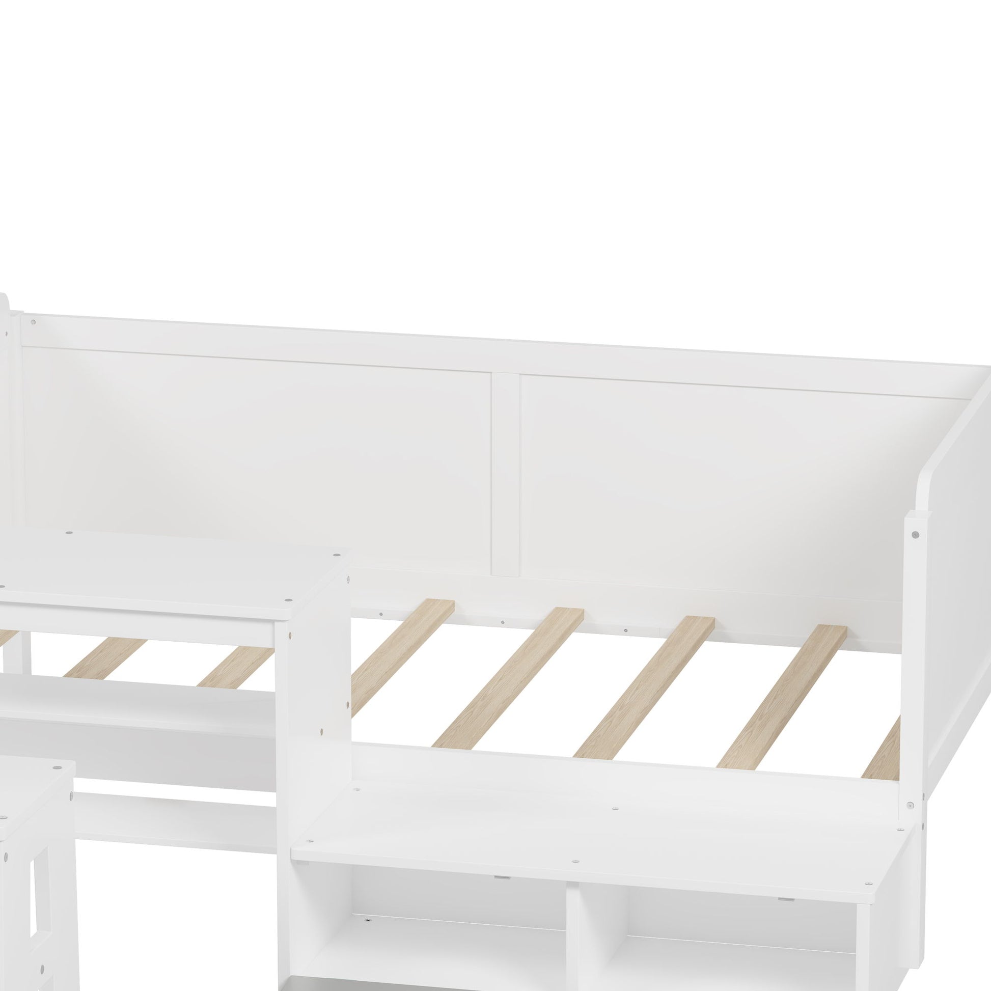 Twin Size Daybed With Storage Shelves And Lockers, Multi Functional Bed With Study Desk And Matching Stool - White