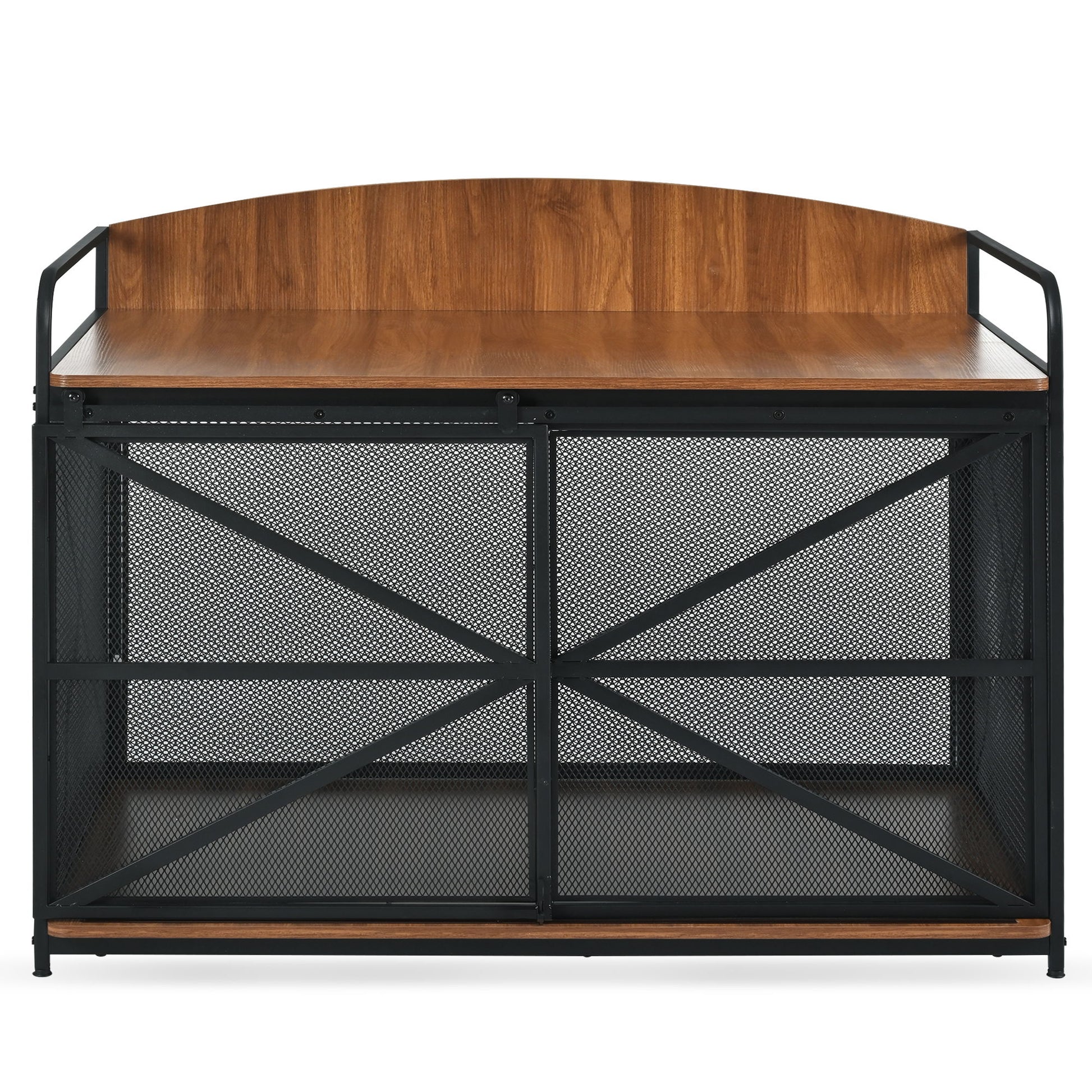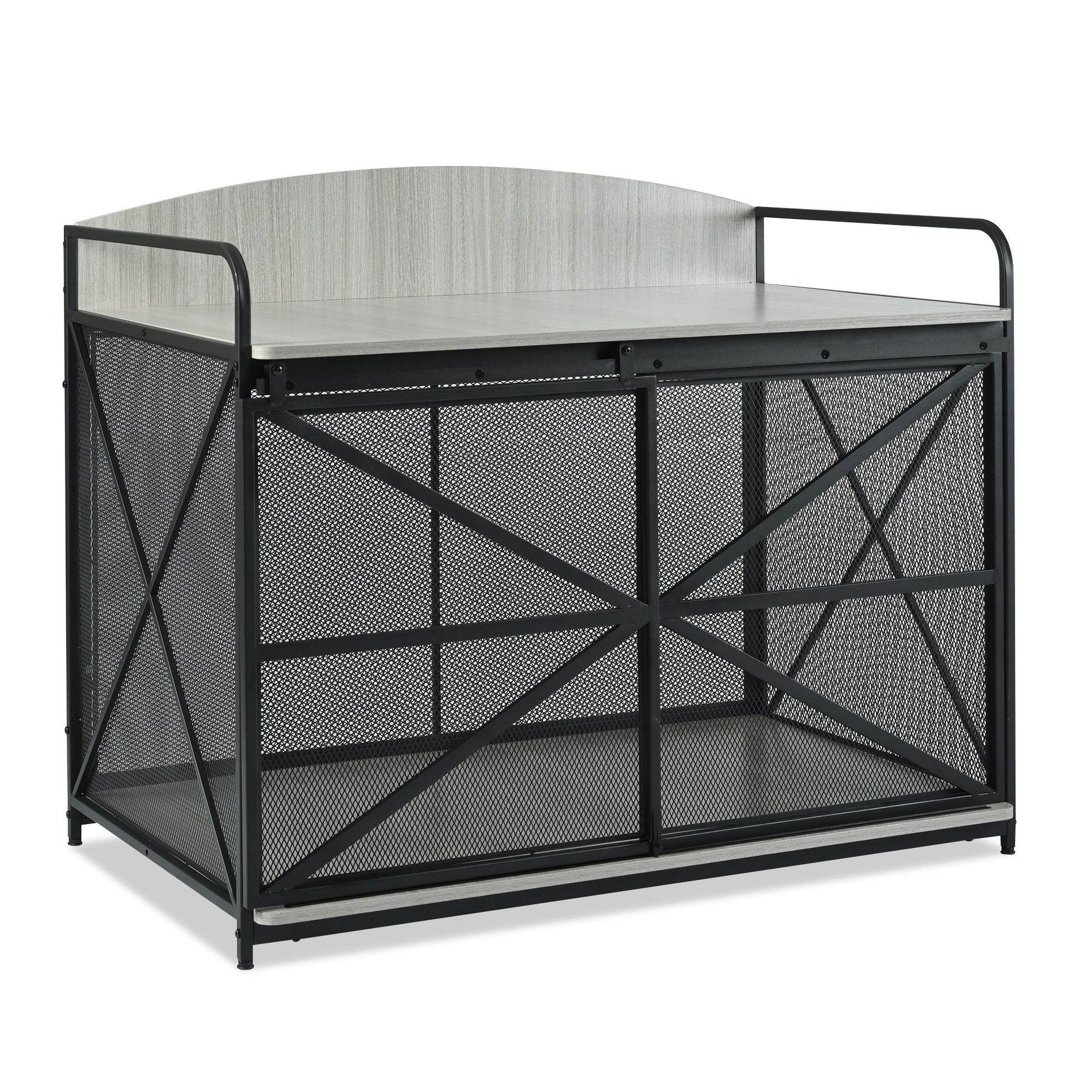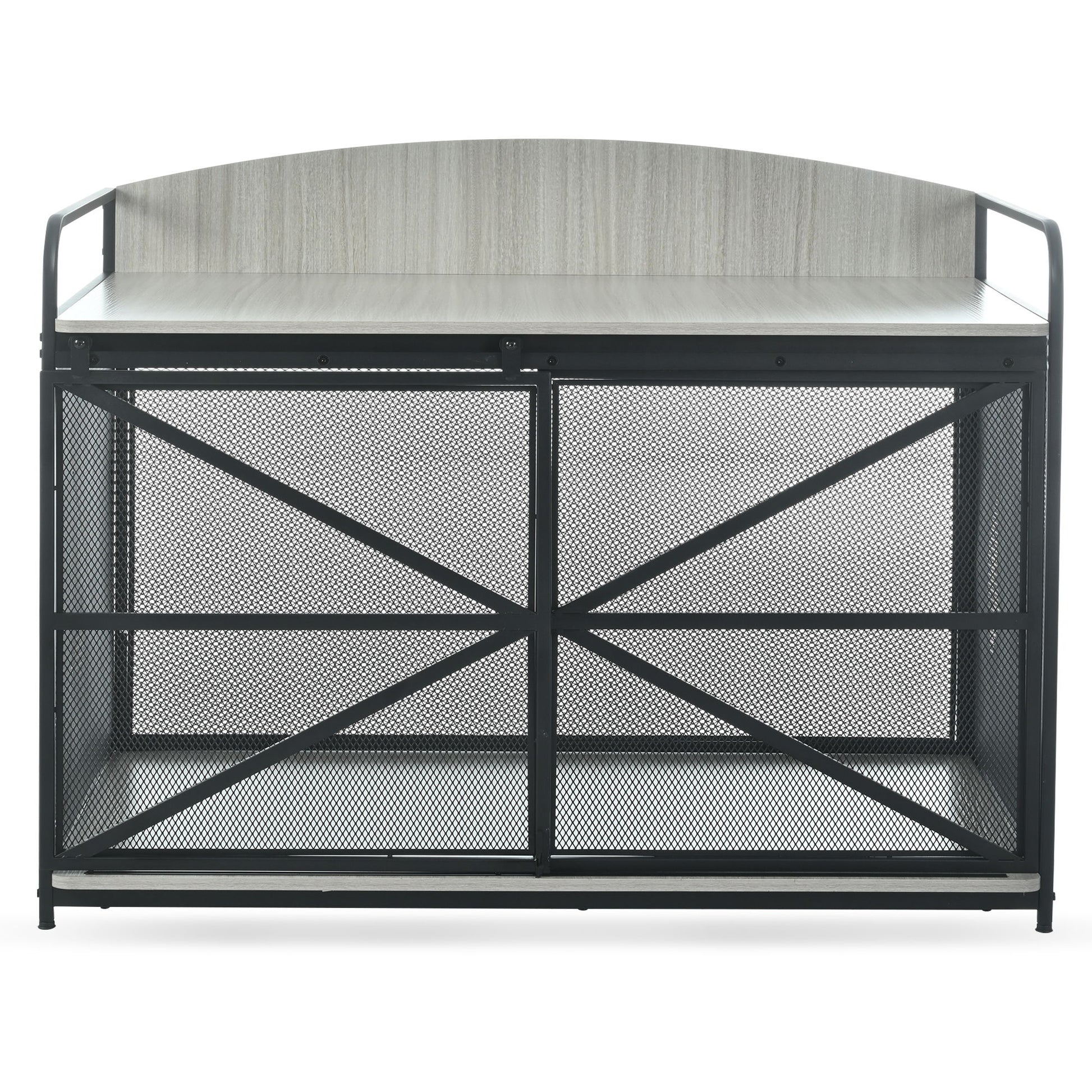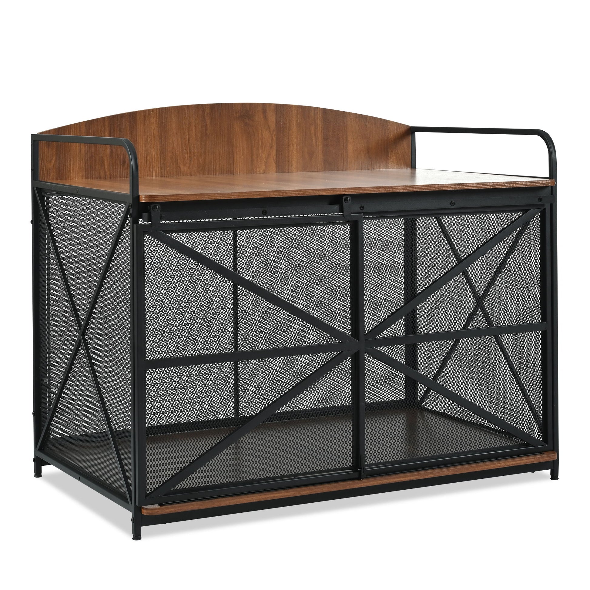- Practical Features: The kennel features a spacious desktop with a curved back panel to store pet supplies and personal items securely. The unique sliding barn door design ensures easy access for dogs and includes a lock for added safety, making it ideal for compact spaces.