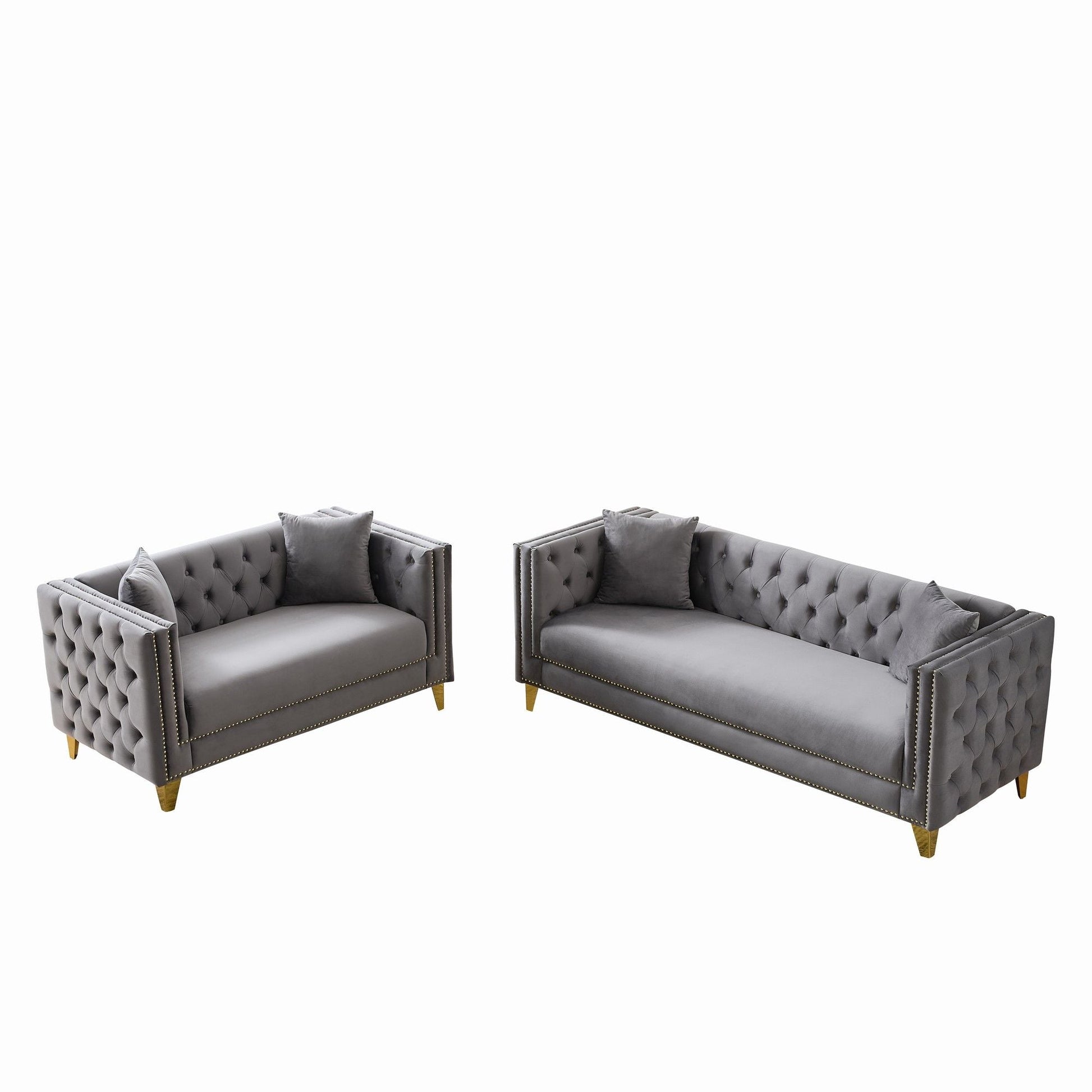 3 And 3 Seater Deep Seat Sofa With Button Nailhead And Square Arm Design - Gray