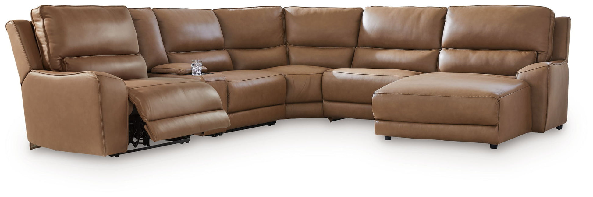 DeepWakes - 6-Piece Power Reclining Sectional With RAF Press Back Power Chaise And Storage Console - Caramel