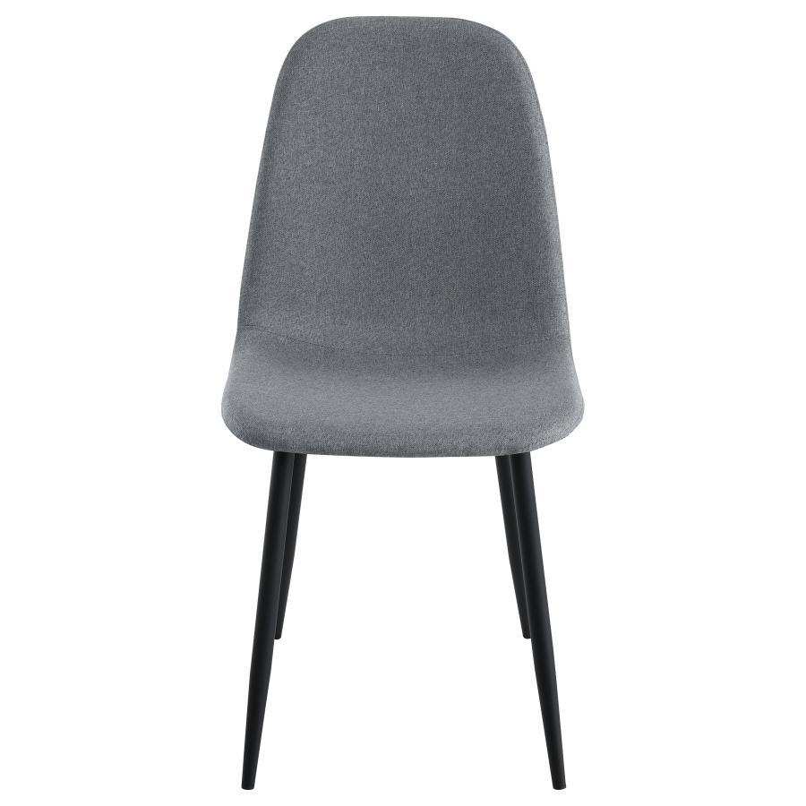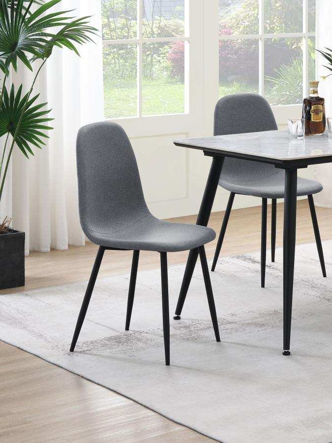 Create an inviting ambiance with a set of four contemporary side chairs. Perfect for a kitchen or dining room table, the chairs boast a light, airy silhouette with stylish, updated appeal. Each includes neutral gray upholstery and a bucket seat that delivers inviting comfort and support. Chairs stand on splayed legs crafted from metal tube with a black finish that blends into surrounding decor. Legs are complete with plastic glides that add protection for delicate flooring.
