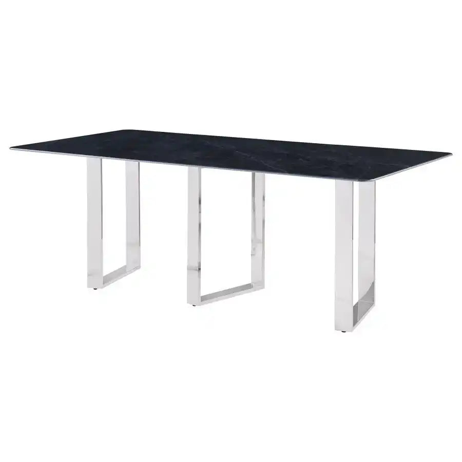 Inject a sense of sophistication with a modern rectangular dining table. Featuring a sintered stone tabletop with a gray marble finish and slim, sleek silhouette, the table becomes a stylish centerpiece in your dining room. It stands on three open frame legs that add airy, sculpted style. The angular presentation of its legs adds intriguing visual dimensionality in any dining room. A polished silver-tones finish is timeless and refined, perfect for your space.