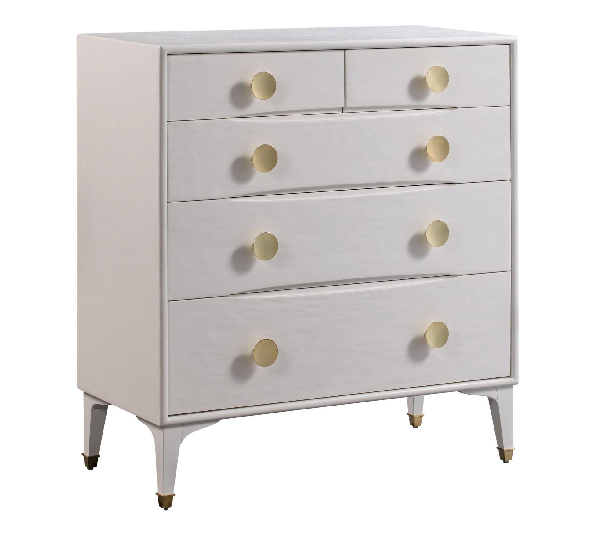 Born to make a statement, the Divine collection offers glam design that'll take your space to the next level. The brass handles and leg-tips pop in contrast to the white finish and the undulating surface provides texture and added sophistication. Combine the chest with the nightstand for the ultimate look.