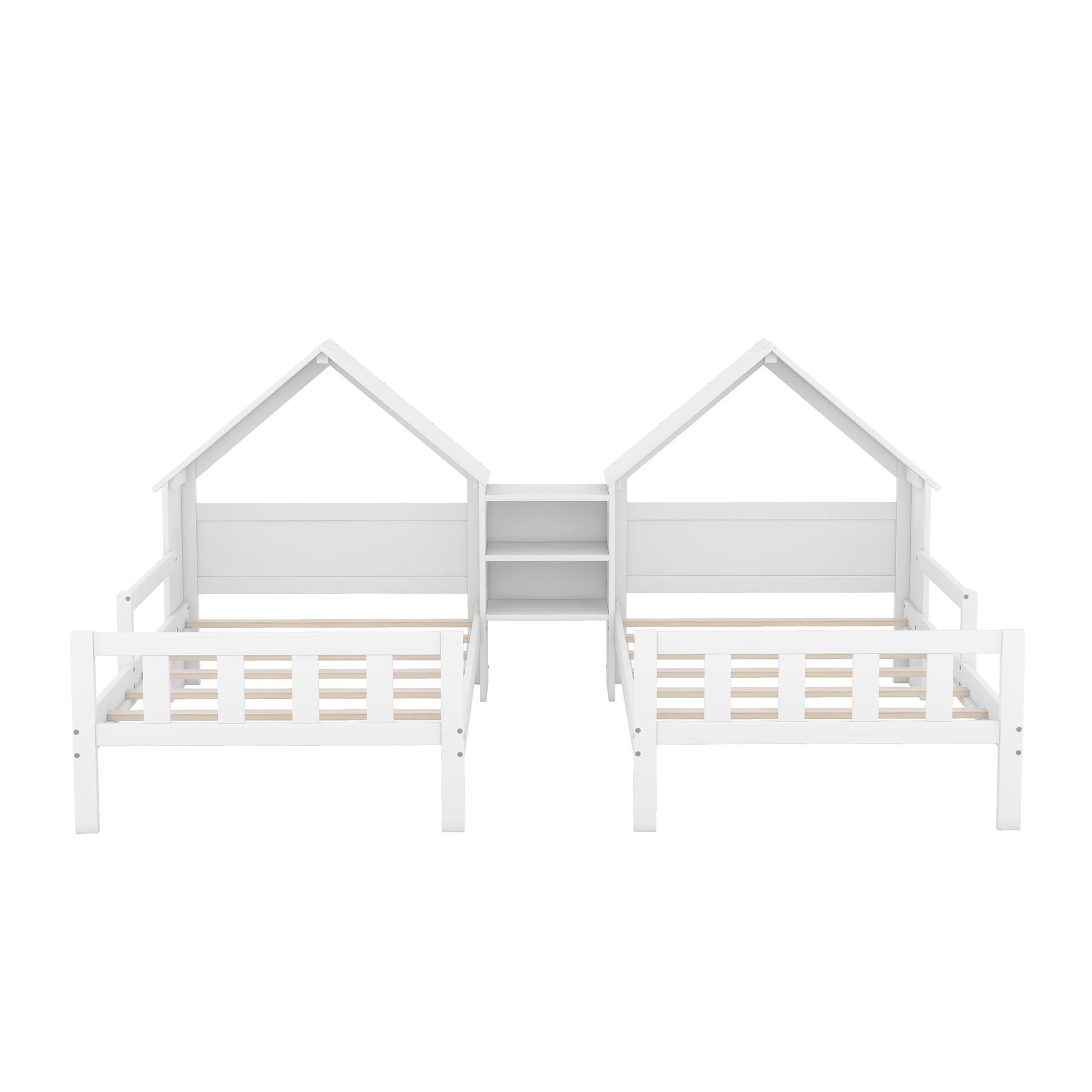 Double Twin Platform Bed With House Shaped Headboard And Built In Nightstand - White