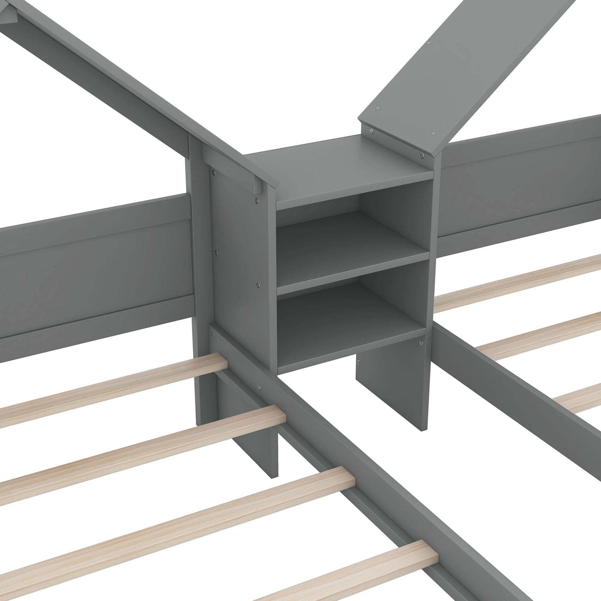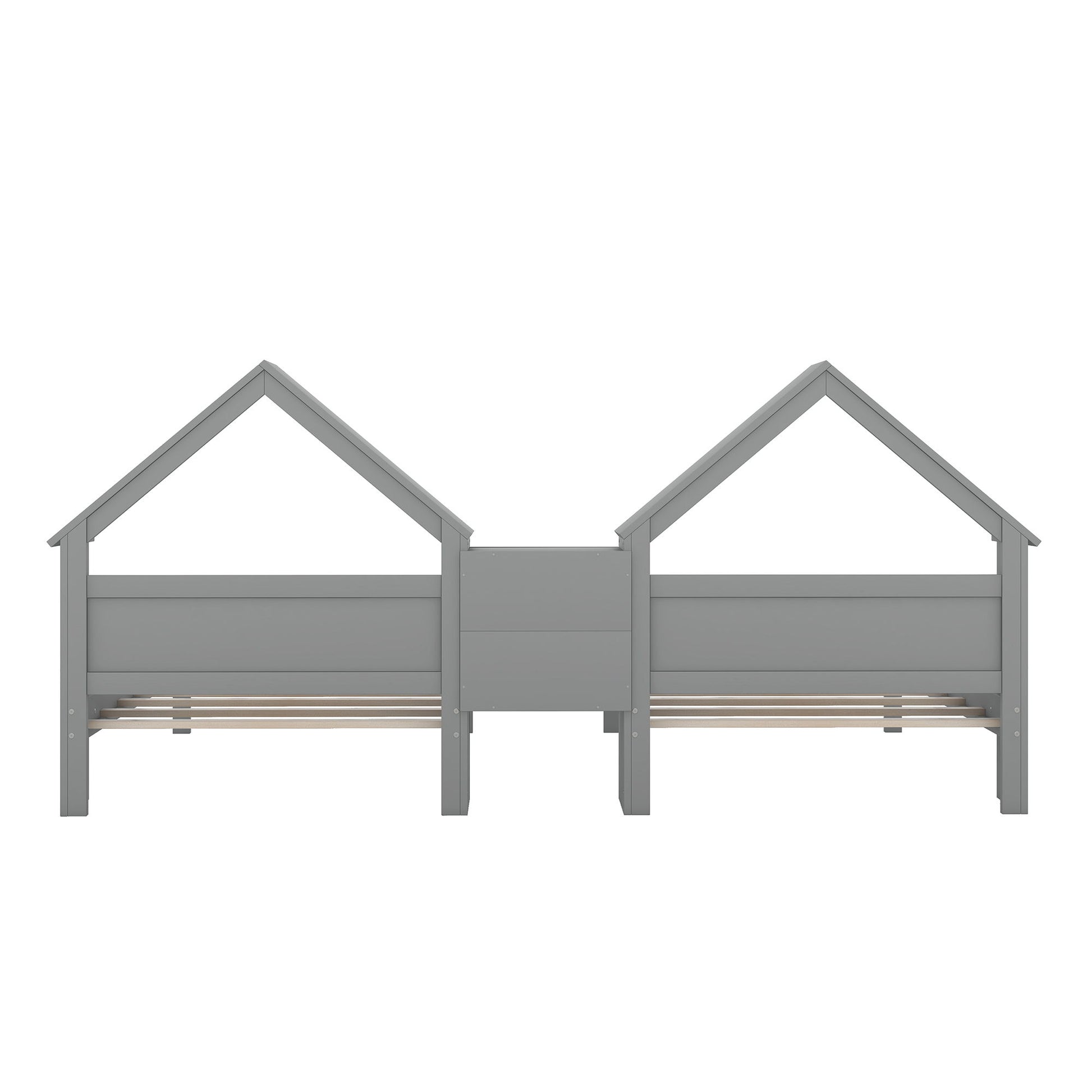 Double Twin Platform Bed With House Shaped Headboard And Built In Nightstand - Gray