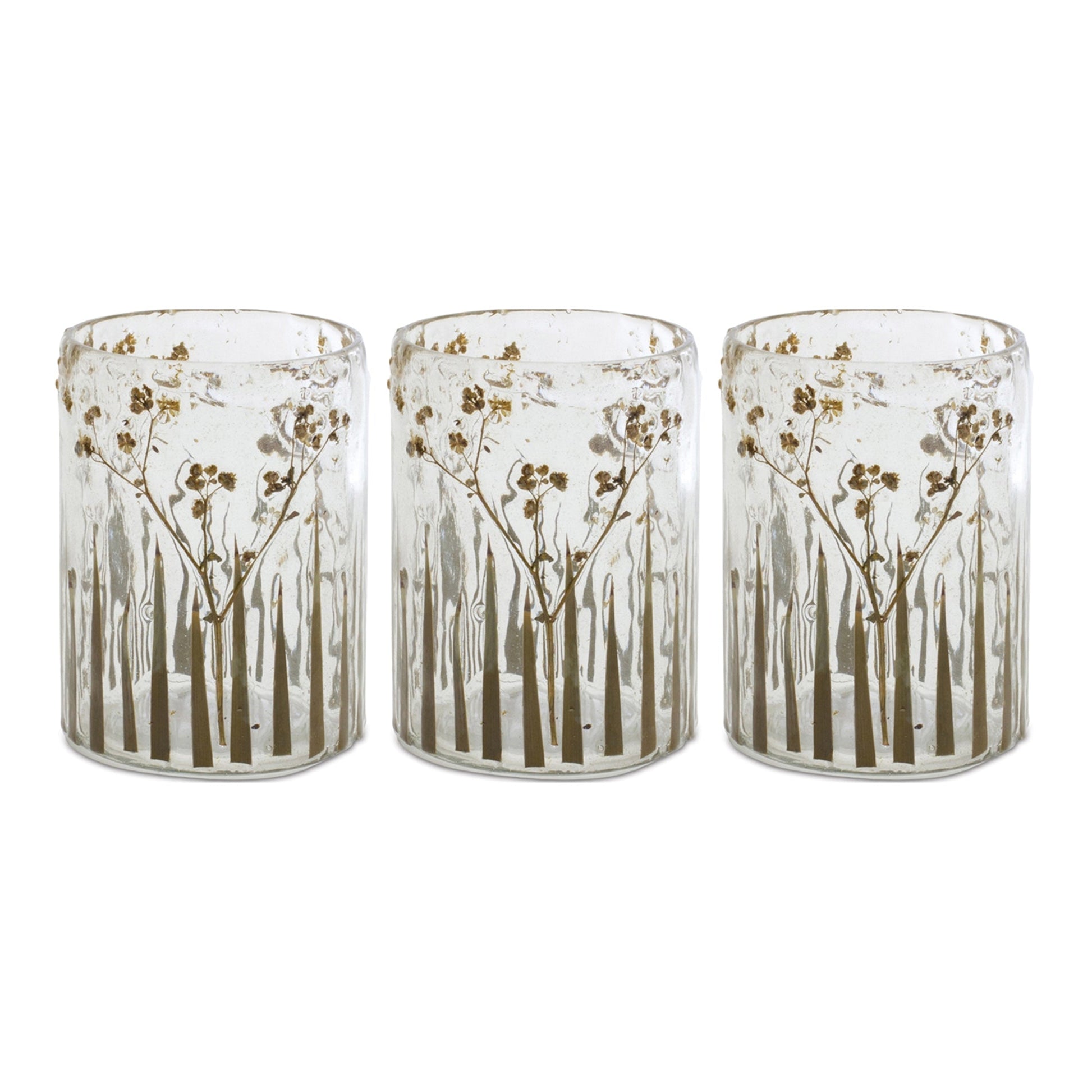 Add a natural element to your home with this beautiful set of Dried Floral Glass Candle Holders. Featuring three pieces, this set is a great fit for your mid-century modern or farmhouse style of decor. The trendy dried yarrow floral embedded in a delicate wavy glass vase accented with blades of grass is the perfect combination to create a stunning display. The quality glass composition is sure to endure for seasons to come. Illuminate the set by adding a real wax or LED candle to each vase. Candles sold separately, this set best fits a 2" votive or tea light candle.