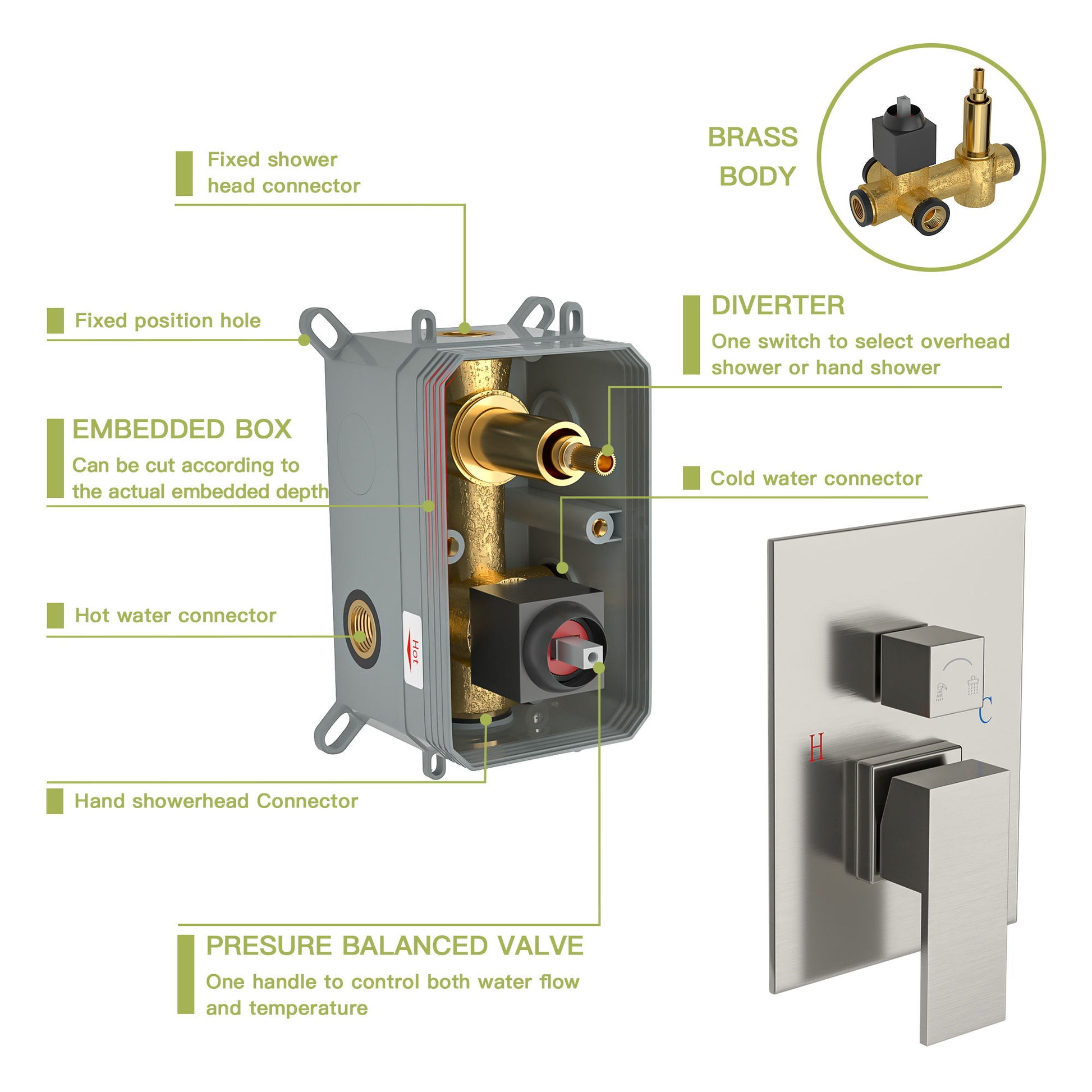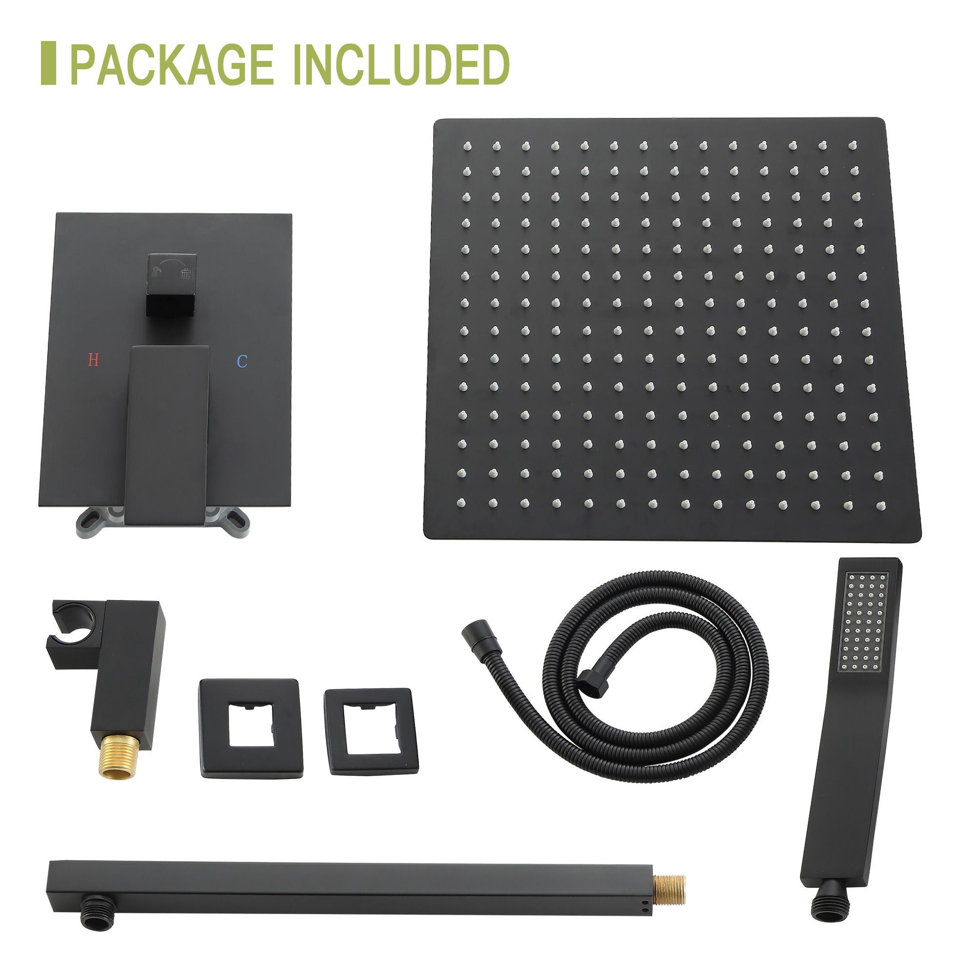 - Included Components: 12 inch square rain shower head, shower arm, handheld shower head, 59" shower hose, shower holder, water control valve, parts, and installation instructions.