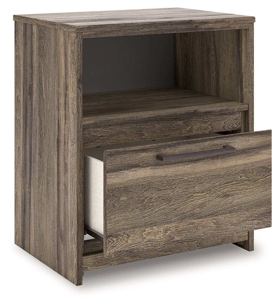 Casually cool style and lots of storage go hand in hand with this nightstand. A weathered brown finish over replicated oak grain creates an easygoing vibe, setting the scene in your restful retreat. The nightstand's clean lines and modern handles provide a fuss-free look. You’ll find its drawer and cubby to be spacious, and the USB charging keeps up with your high-tech lifestyle.