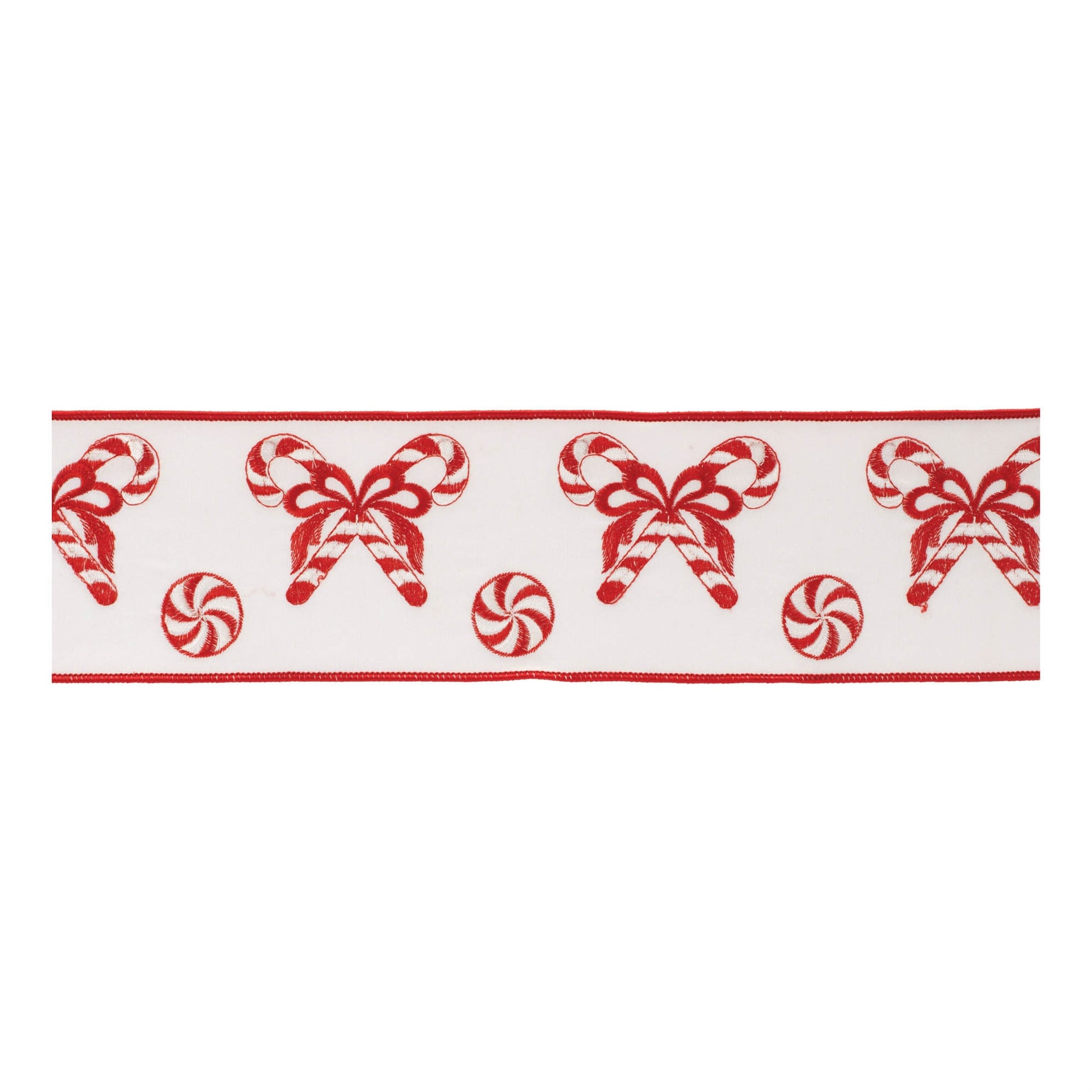 Add a touch of festive charm to your holiday projects with this Embroidered Peppermint Wired Ribbon. Featuring a bright red and white color scheme and a whimsical embroidered peppermint candy design, this 4" wide ribbon is perfect for making a statement in your décor and crafts. Made from soft cotton with wired edges, it’s designed for sturdy displays and easy shaping. Whether you’re wrapping gifts, decorating for the holidays, or creating crafts, this versatile ribbon brings a sweet holiday spirit to any project.
