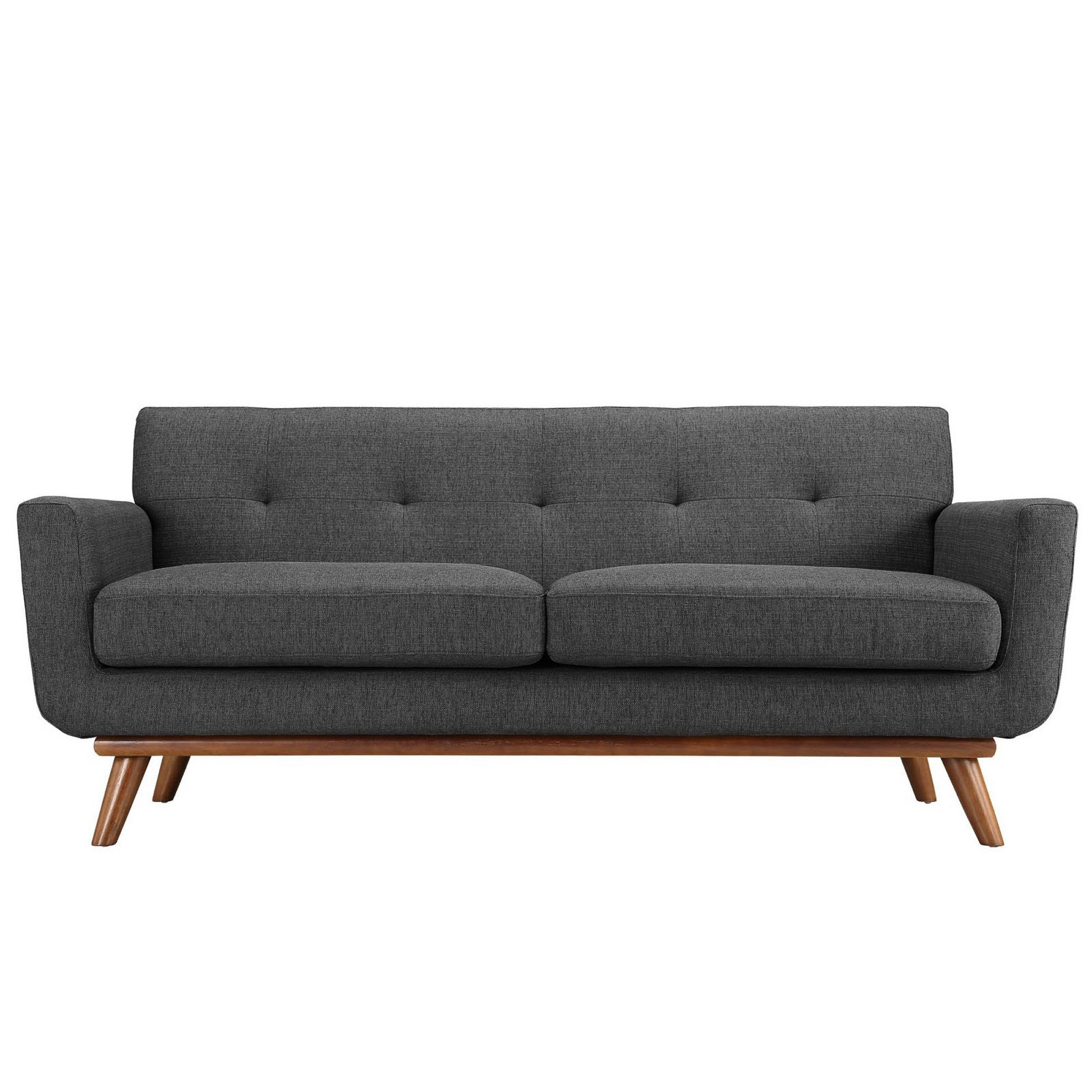 Gently sloping curves and large dual cushions create a favorite lounging spot. Whether relaxing after a long day at work, settling in with coffee and brunch, or entering a spirited discussion with friends, the Engage loveseat is a welcome presence in your home. Five tufted buttons create eye-catching appeal, adding depth that brings your sitting d�cor to center stage. Four cherry color rubberwood legs and frame supply a solid base to the comfortable upholstered material.