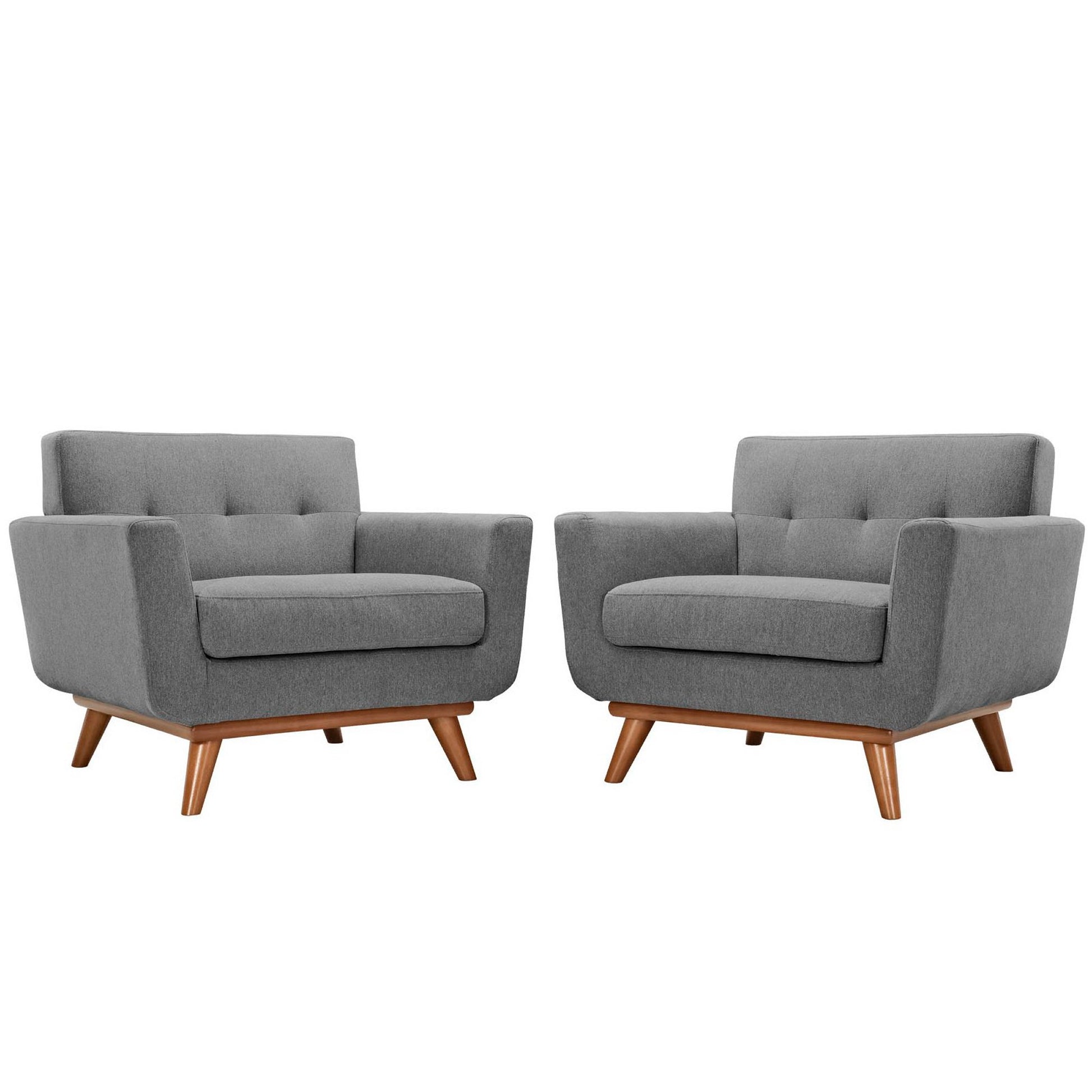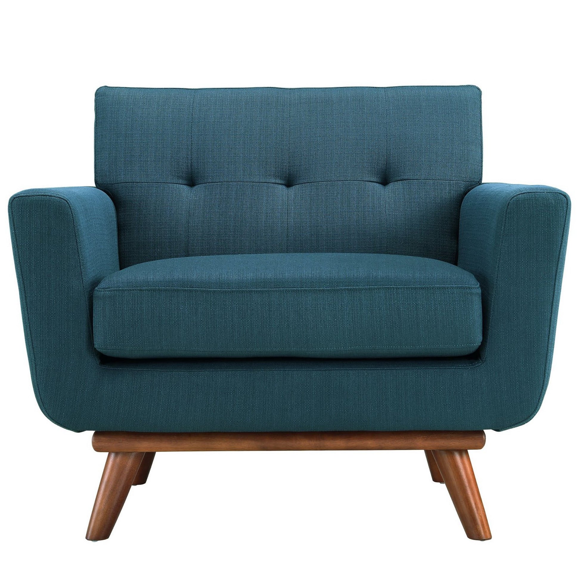 Gently sloping curves and large dual cushions create a favorite lounging spot. Whether plopping down after a long day at work, settling in with coffee and brunch, or entering a spirited discussion with friends, the Engage armchair is a welcome presence in your home. Seven tufted buttons create eye-catching appeal, adding depth that brings your sitting d�cor to center stage. Four cherry color rubberwood legs and frame supply a solid base to the comfortable upholstered material.