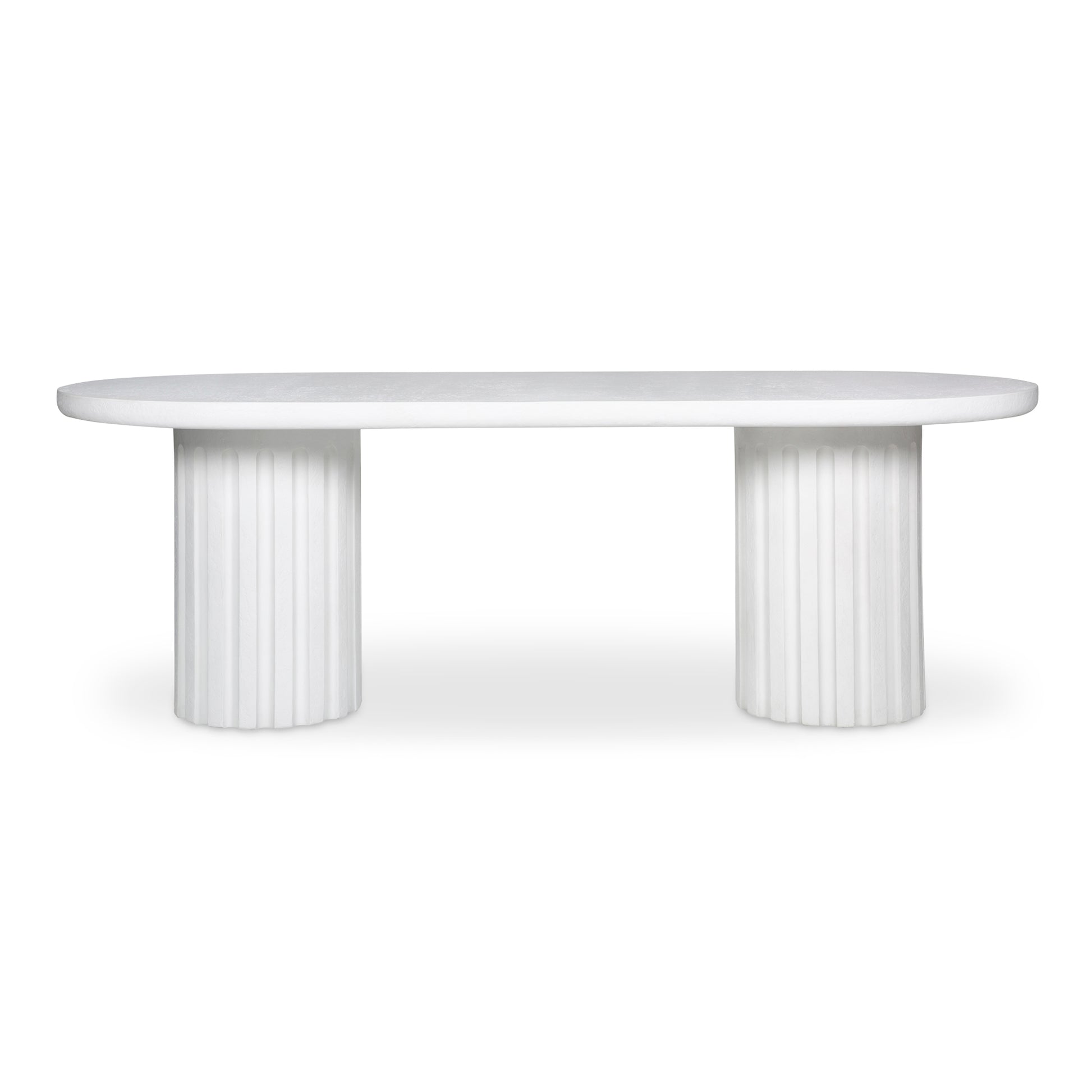 A striking interplay of shapes, the Eris outdoor dining table embraces round forms with a column-like fluted side. The rough concrete texture adds depth and complexity to an otherwise simplistic form, making it a statement piece suitable indoors and out. Exceptionally composed of Glass Fiber Reinforced Concrete (a fusion of cement, glass fiber, and Styrofoam), this table offers unique aesthetics while maintaining its beauty.