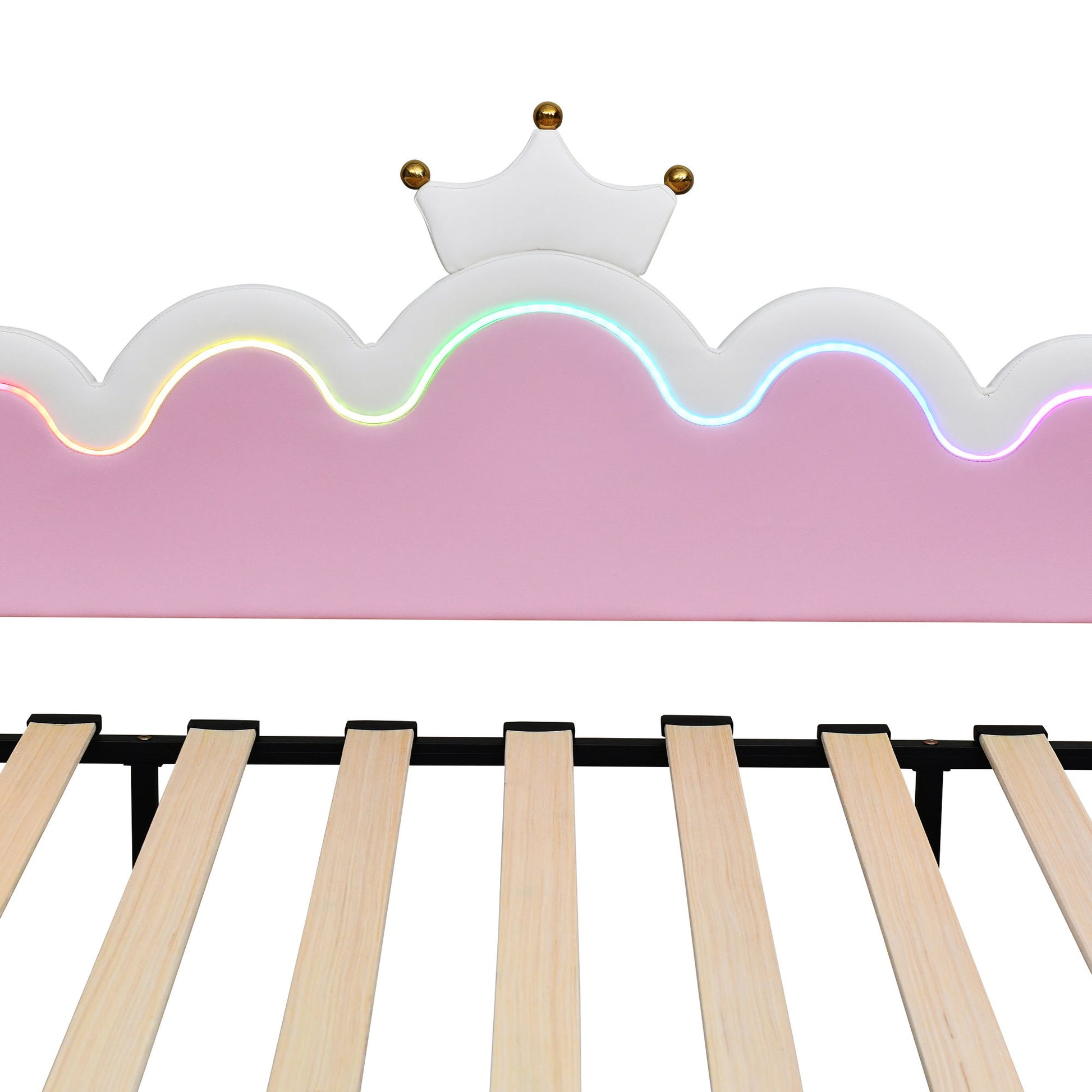 Twin Extending Daybed With LED Lights, Modern Upholstered Princess Daybed With Crown Headboard - Pink