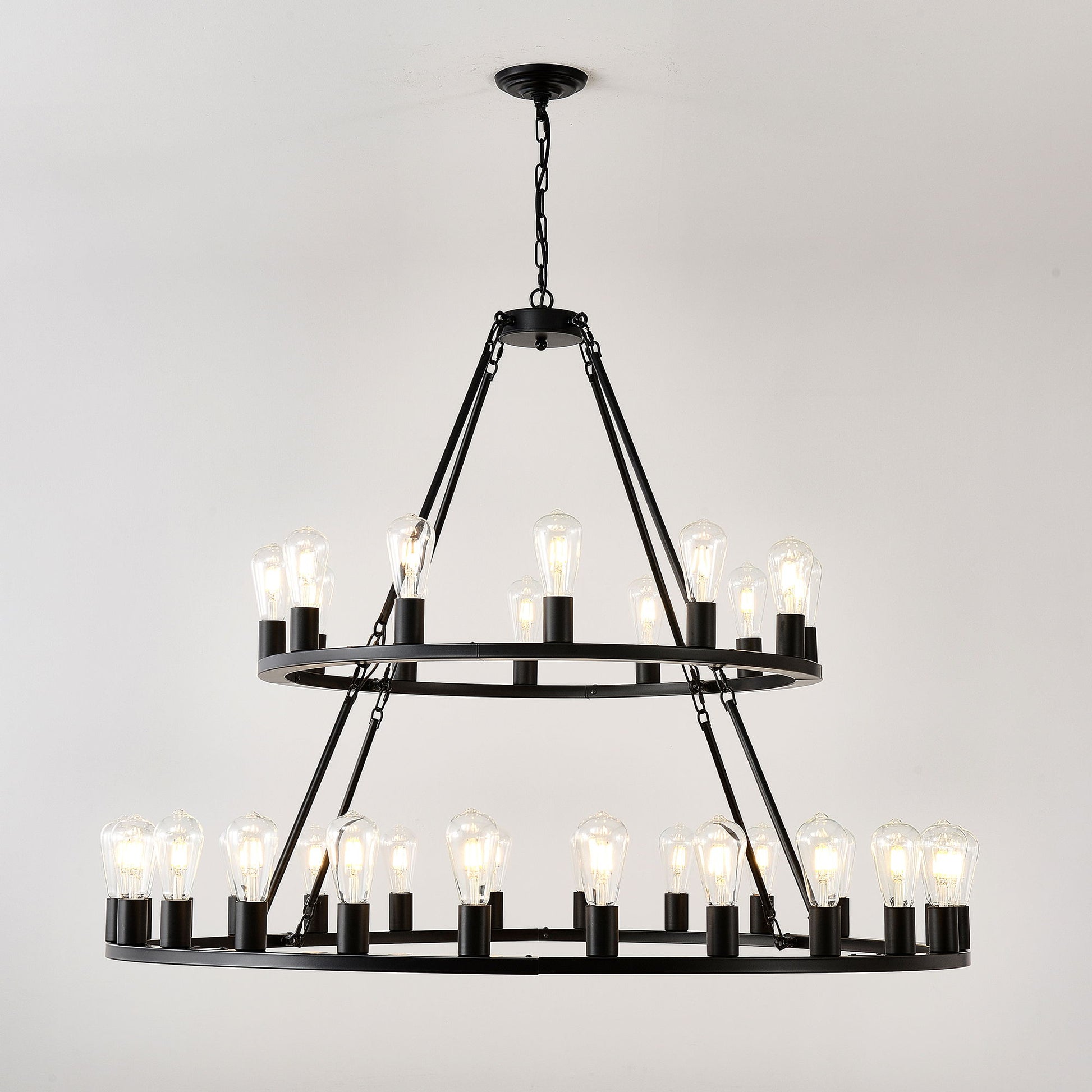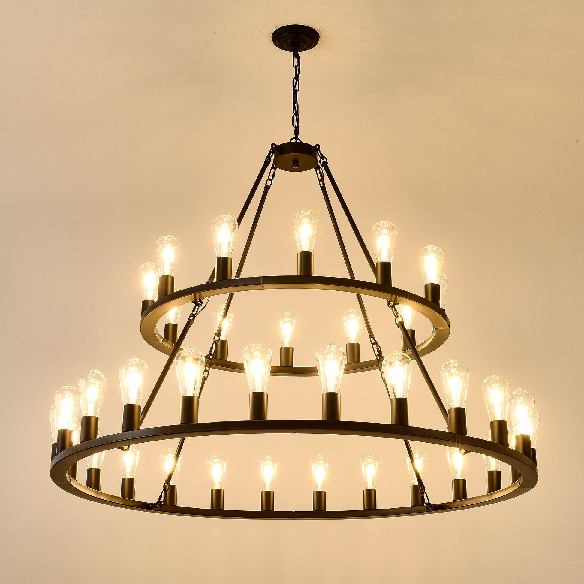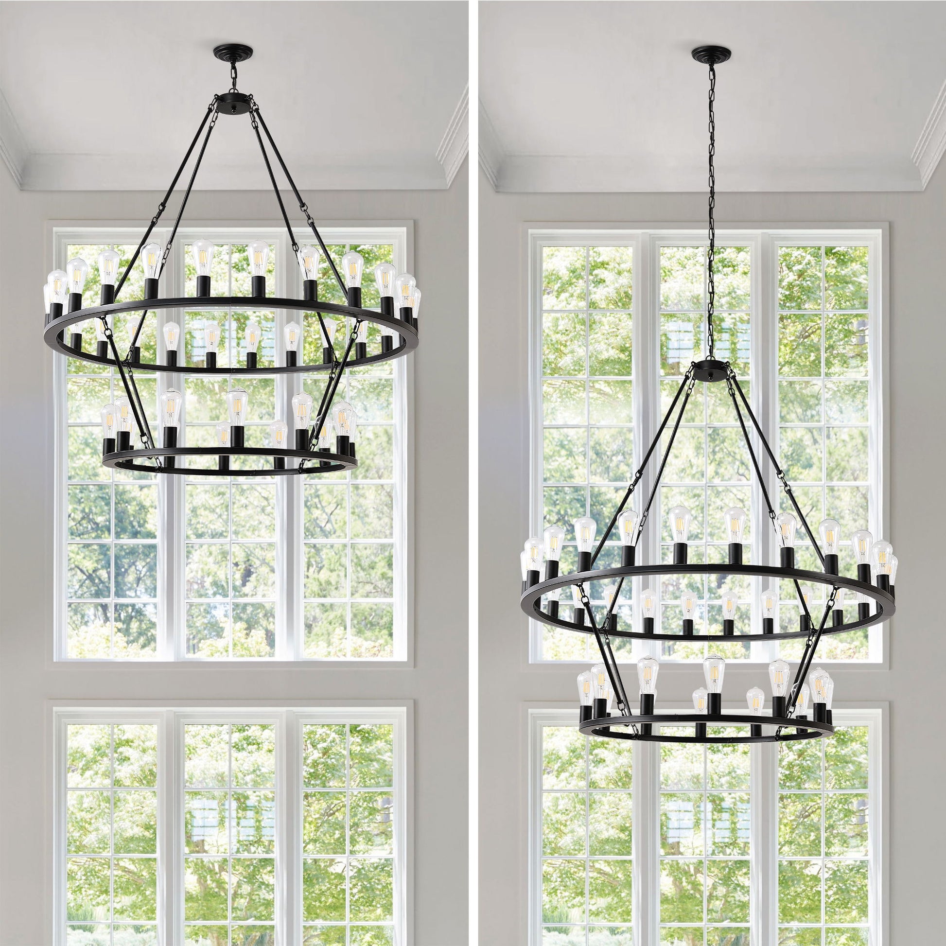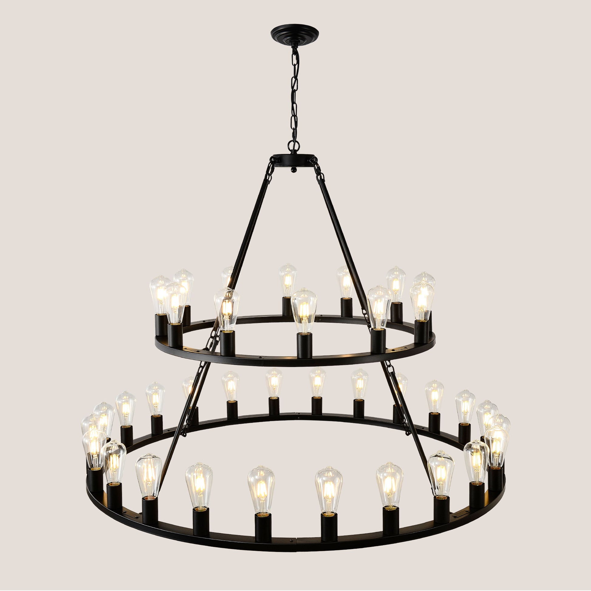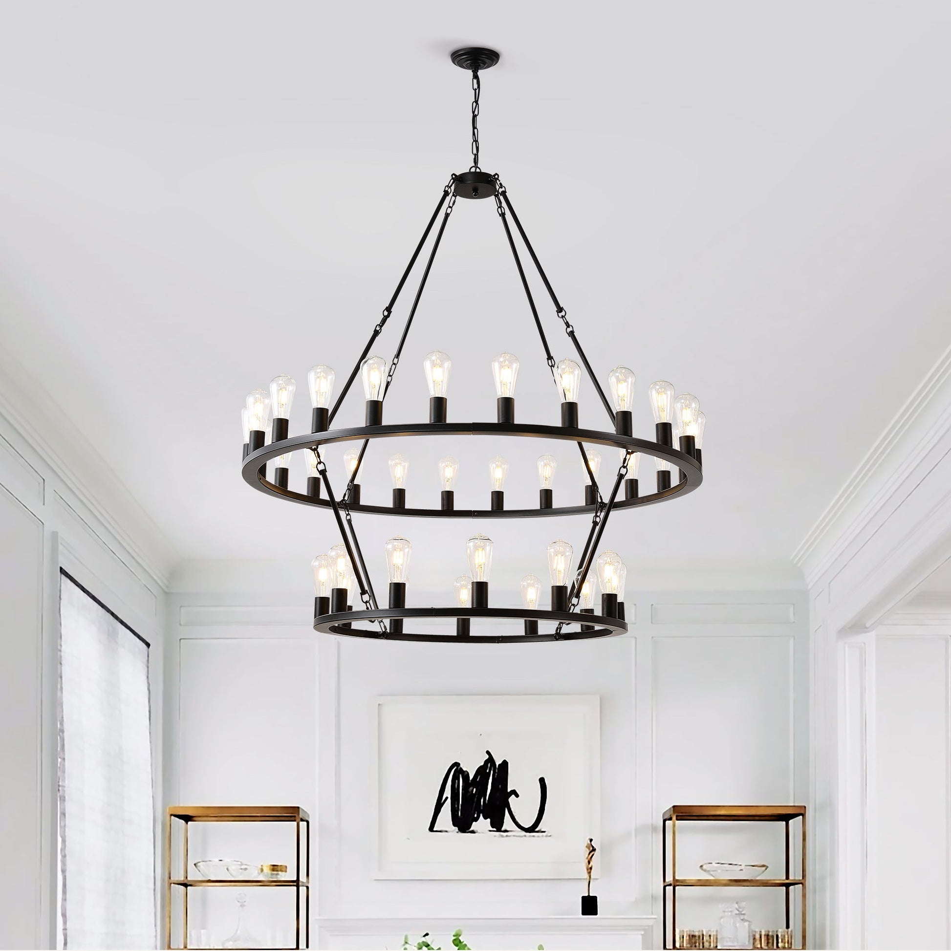 Extra Large Wagon Wheel Chandelier, 2 Tier 36 Lights (No Include) Farmhouse Industrial Round High Ceiling Pendant Light Adjustable Chain, For Dining Room, Living Room, Kitchen - Black