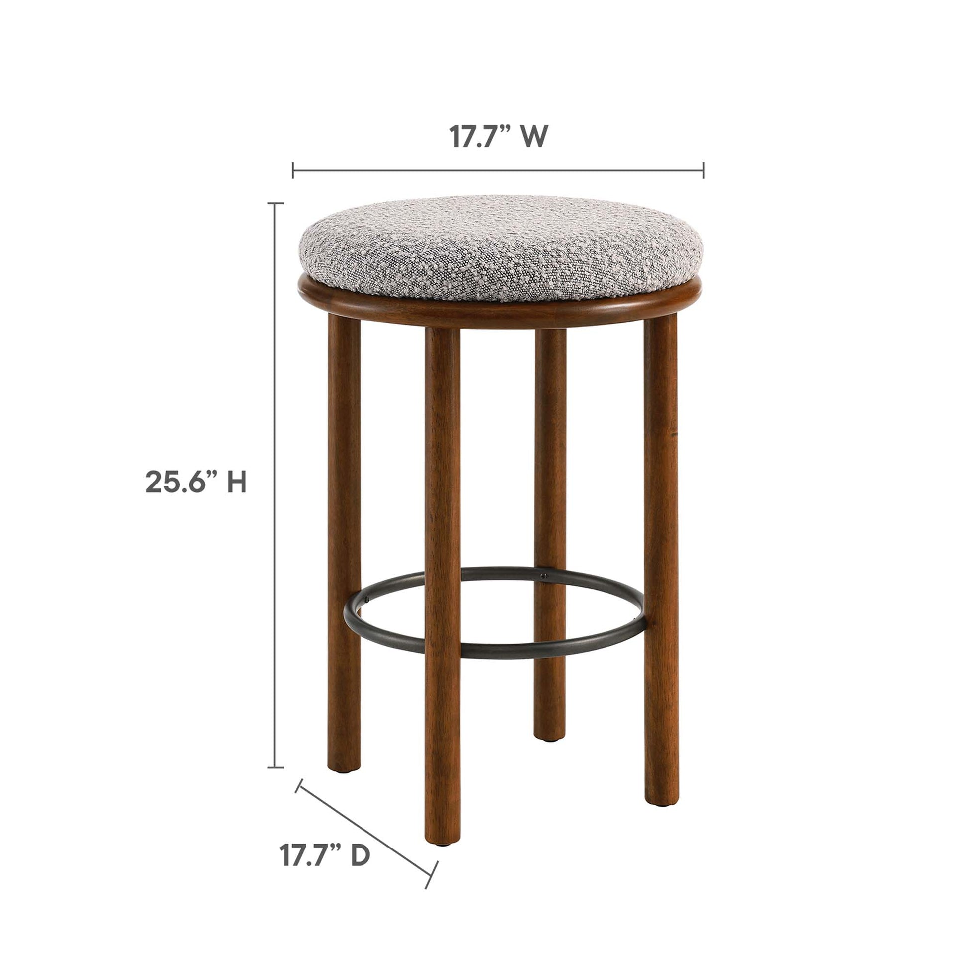 The Fable Counter Stool Set of Two embodies a streamlined design with a dash of modern flair, effortlessly fitting for a stylish, contemporary kitchen or any part of the home. These 26 inch counter stools are backless, showcasing a sleek profile that enhances everything from minimalist decors to eclectic spaces. Adorned with plush, round boucle fabric seats with foam padding for comfort, the Fable countertop stools provide a sensory experience as you enjoy a meal or savor your morning espresso. The solid wood frames and legs of these counter stools form a sturdy foundation, showcasing the beauty of natural wood grains, while the integrated metal footrest invites a relaxed posture, perfect for prolonged seating. Each boucle stool comes with non-marking foot glides, a thoughtful addition that preserves your flooring and enhances stability. Assembly is straightforward, allowing these accent furniture pieces to blend into your living space with ease. Whether placed alongside a kitchen counter or as island stools, the Fable backless counter stools are a testament to timeless design, harmonizing purpose with style. Weight Capacity: 500 lbs.