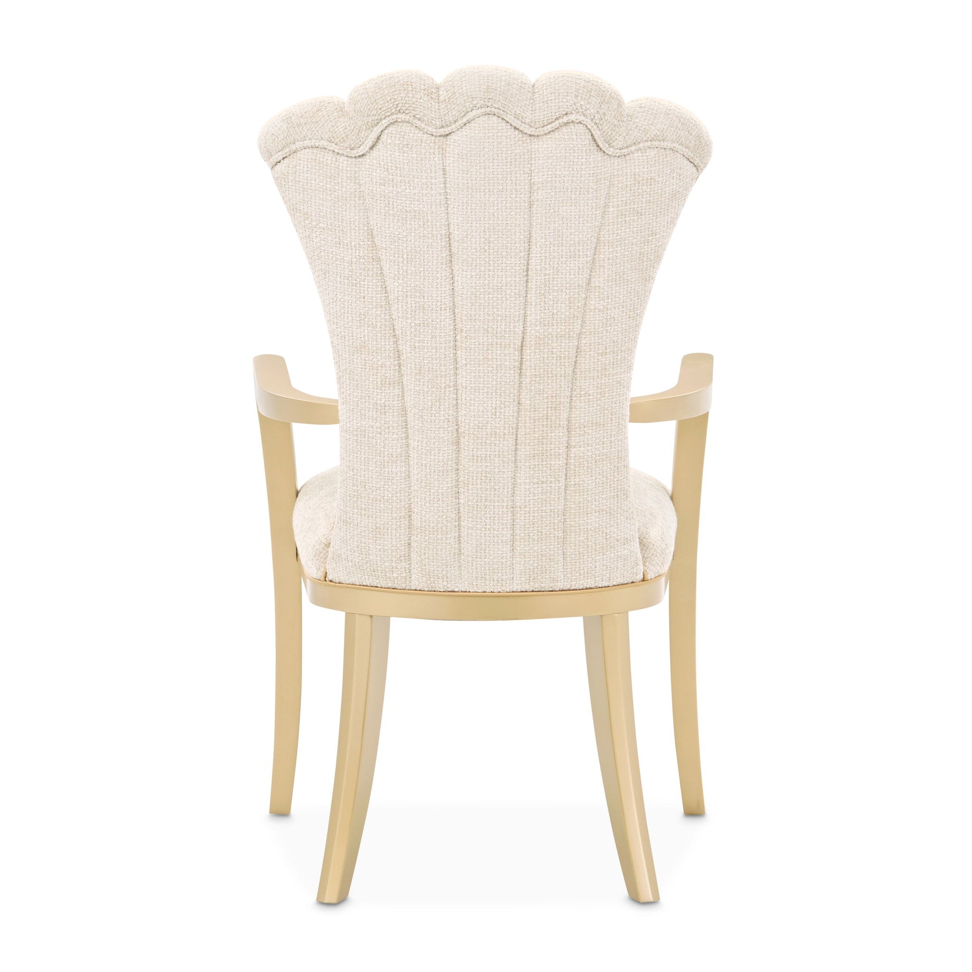 An elegant blend of form and comfort, the Fantosini Arm Chair offers a regal presence at the dining table. The sculpted backrest fans out in graceful channels, enveloped in plush chenille upholstery that radiates softness in a natural hue.