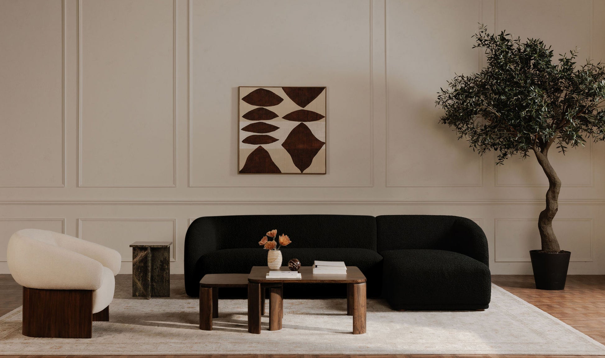 Available in three elevated upholstery options — Beige Bouclé, Black Bouclé, and Tan Faux Mohair — the Faye Sectional adds rich texture and visual depth to any space. Plush cushions and thoughtful construction deliver everyday comfort without sacrificing style, making it ideal for both entertaining and unwinding.