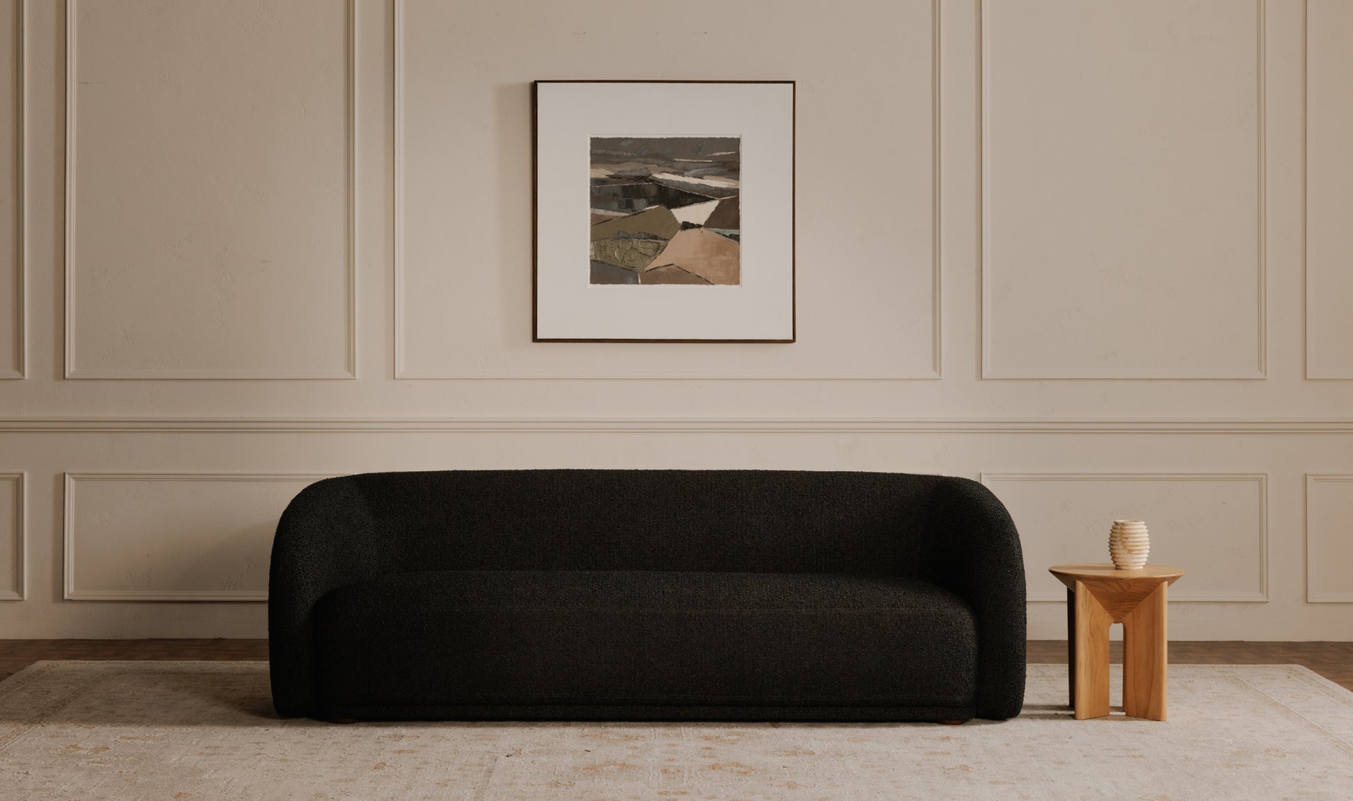 Available in three elevated upholstery options — Beige Bouclé, Black Bouclé, and Tan Faux Mohair — the Faye Sofa offers rich texture and visual depth while maintaining a timeless aesthetic. Plush seating and thoughtful construction provide a relaxed lounge experience without sacrificing style.