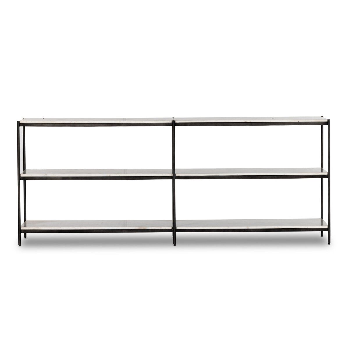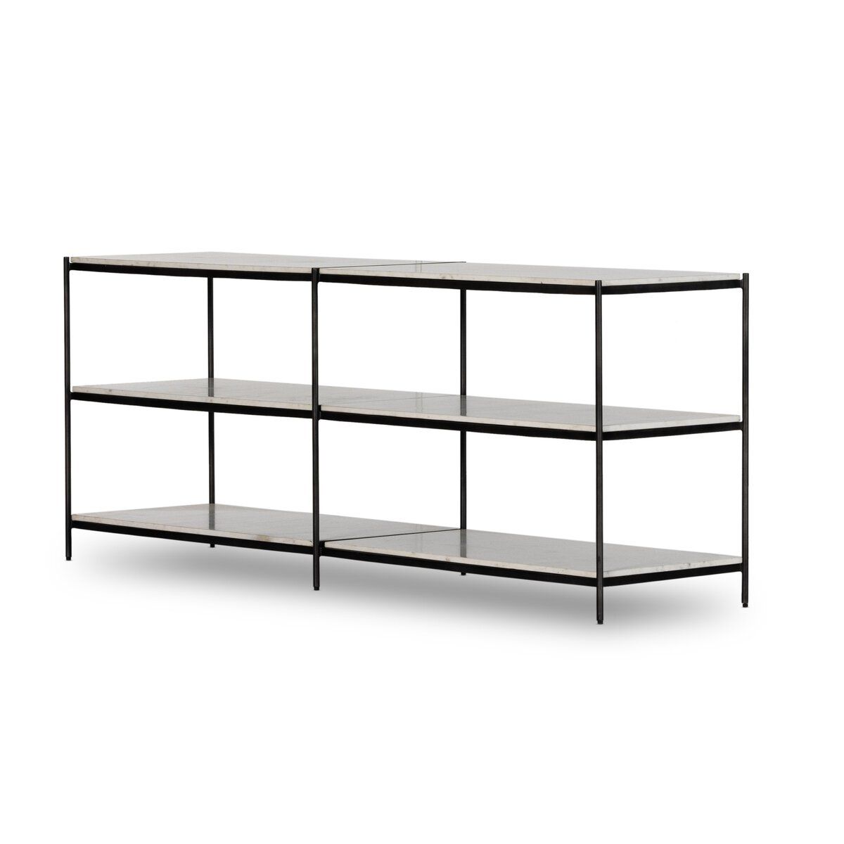 Three open tiers of polished white marble provide generous surface space while enhancing the table’s light, layered look. The contrast between cool stone and textured metal underscores the craftsmanship behind the design, offering a console table that functions as both a practical anchor and a sculptural statement.
