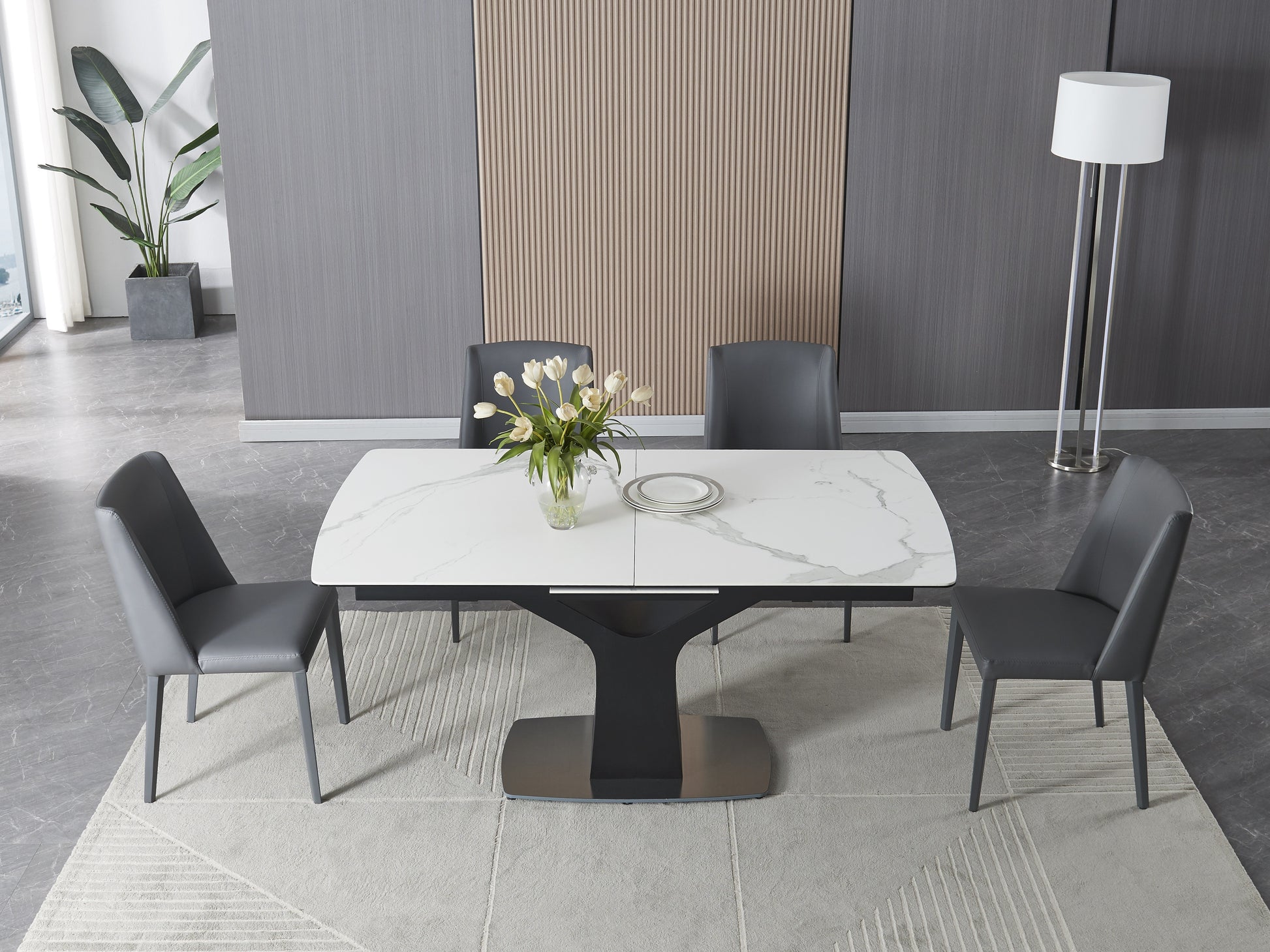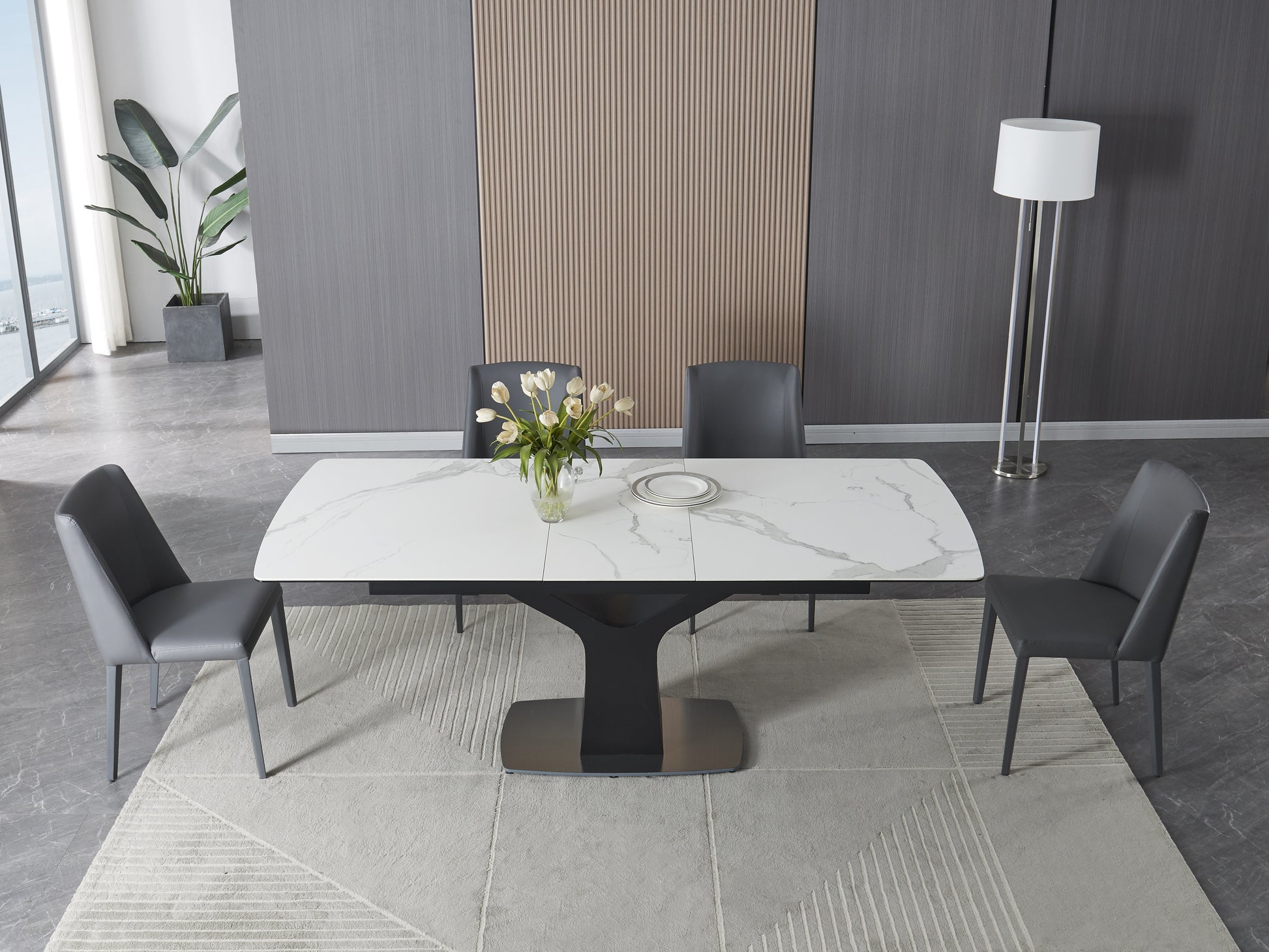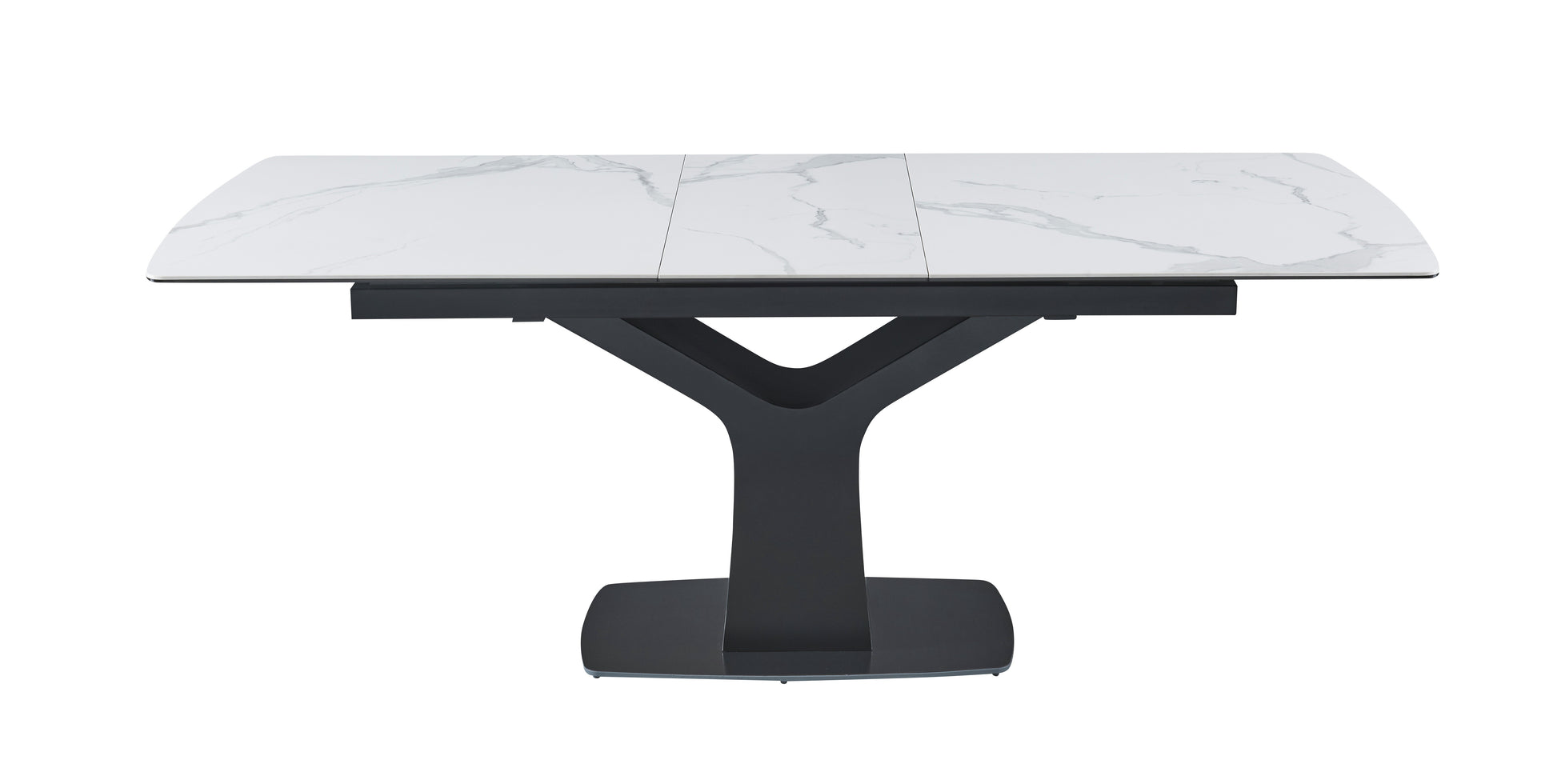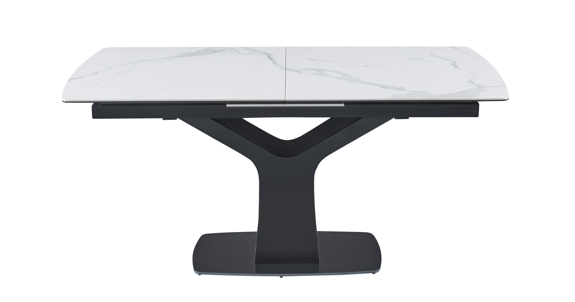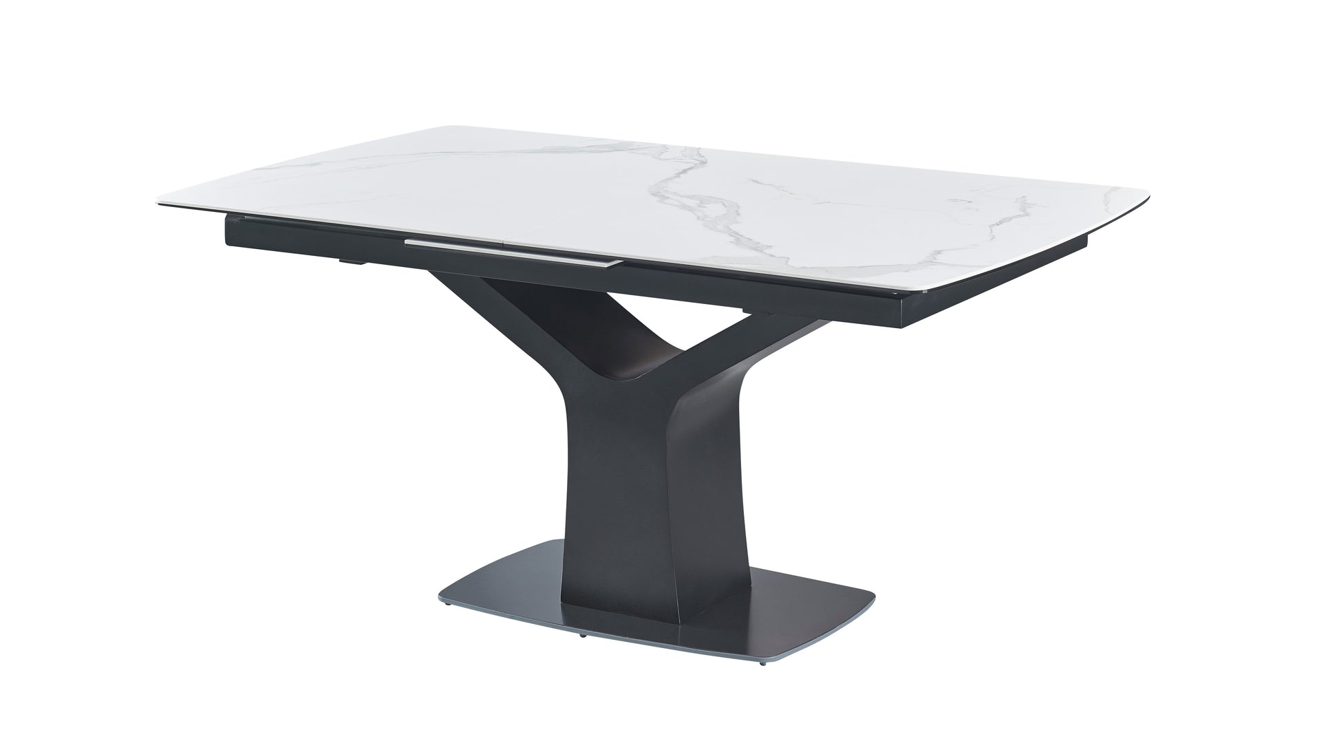 Its matte black metal base adds a striking contrast, creating a sleek, contemporary profile that complements a wide range of interiors. The Fiori’s center pop-out extension mechanism allows for effortless expansion — simply open the hidden leaf to transform the table and easily accommodate more guests. When closed, it maintains a compact, minimalist silhouette ideal for smaller spaces.