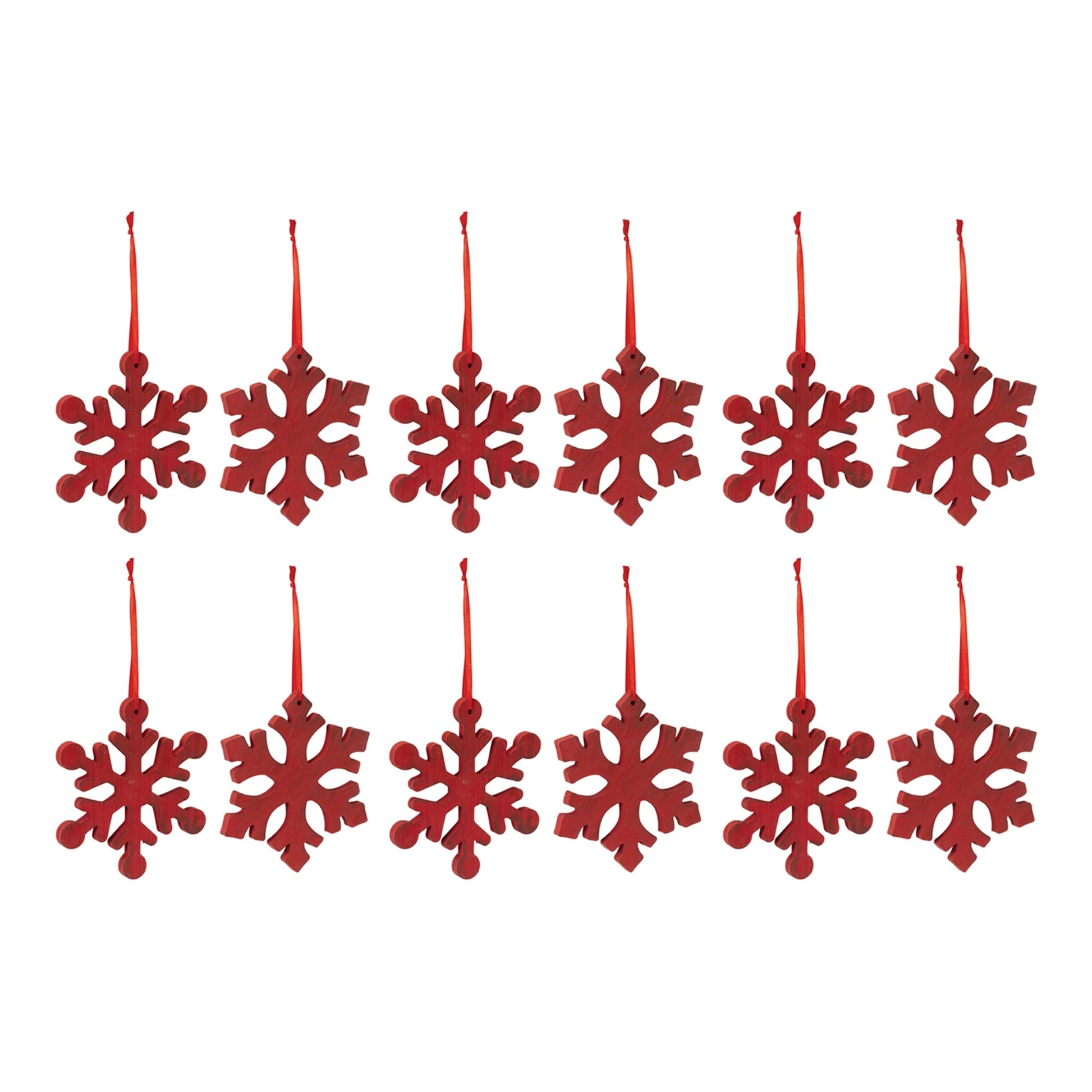 Adorn your Christmas tree and holiday decor with this stunning set of Fir Wood Snowflake Ornaments. Featuring 12 pieces, the festive red tones paired with the snowflake design is the perfect combination to create a memorable display. The quality fir wood composition and delicate ribbon hanging accent is sure to endure for seasons to come. Whether you're adding a touch of cheer to your home or gifting to a loved one, these ornaments will definitely bring smiles.